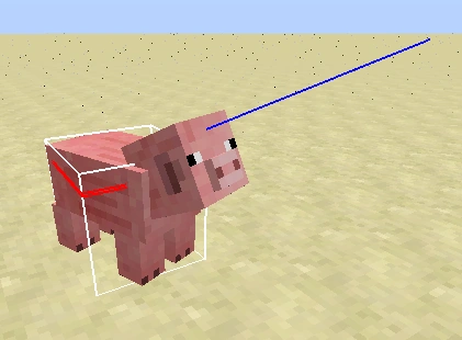 Blickrichtung beim Schwein Zeigt die Hitboxen von Objekten an. Unsichtbare Kreaturen und Mitspieler zeigen allerdings keine Hitbox. Die Höhe der internen Kameraposition (Augenhöhe) wird durch einen roten Ring um die Hitbox angezeigt, die Blickrichtung durch einen blauen Strahl, der aus dem Zentrum des roten Ringes hervorgeht. Die Kameraposition muss nicht mit den auf der Textur aufgemalten Augen übereinstimmen. | |