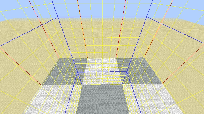 Die Chunkmarkierungen Stellt die Grenzen von Chunks dar (16×16×256 Block große Bereiche der Welt). Die Sektionen (16×16×16 große Teilbereiche) des Chunks, in dem man sich gerade befindet, werden durch blaue Linien markiert. Dazwischen befindet sich ein 2×2 Block großes Gitter aus gelben Linien. Die Ecken der acht Nachbarchunks werden durch rote Linien dargestellt. Nützlich für Messungen und für Untersuchungen der Chunkdaten. | |
