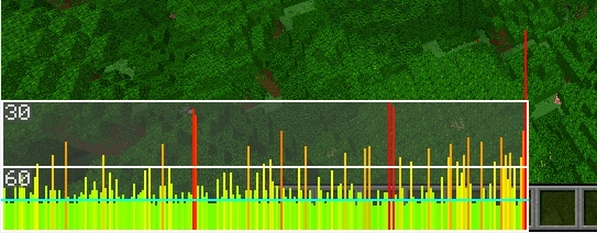Wenn der Debug-Bildschirm mit Alt + F3 aufgerufen wird, wird von rechts nach links laufend ständig die aktuelle Bildrate als Balkendiagramm angezeigt. Die Werte 30 fps und 60 fps sind durch horizontale, weiße Linien markiert. Der im Menü/Optionen/Grafikeinstellungen eingestellte fps-Wert wird als hellblaue Linie markiert.