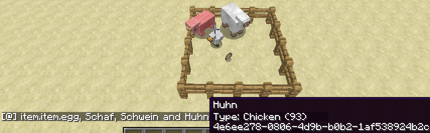 | Looking at block | Die X-, Y- und Z-Koordinaten des Blockes, den man anschaut, d.h. dessen Hitbox man sieht. Diese Koordinaten sind sehr hilfreich bei der Eingabe von Befehlen. Wenn der Block zu weit weg ist, sieht man keine Hitbox und auch nicht diese Anzeige. |