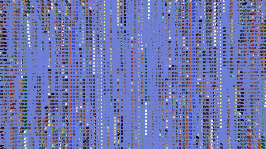 Die Welt im Debug-Modus: die Blockreihe beginnt außerhalb des Bildes rechts unten. Einen großen Teil nehmen die Feuervarianten ein (rechts), gefolgt von den Redstonekabelvarianten (links). Die vermeintliche Lücke in der Blockreihe links sind die kaum sichtbaren Stolperdrahtvarianten