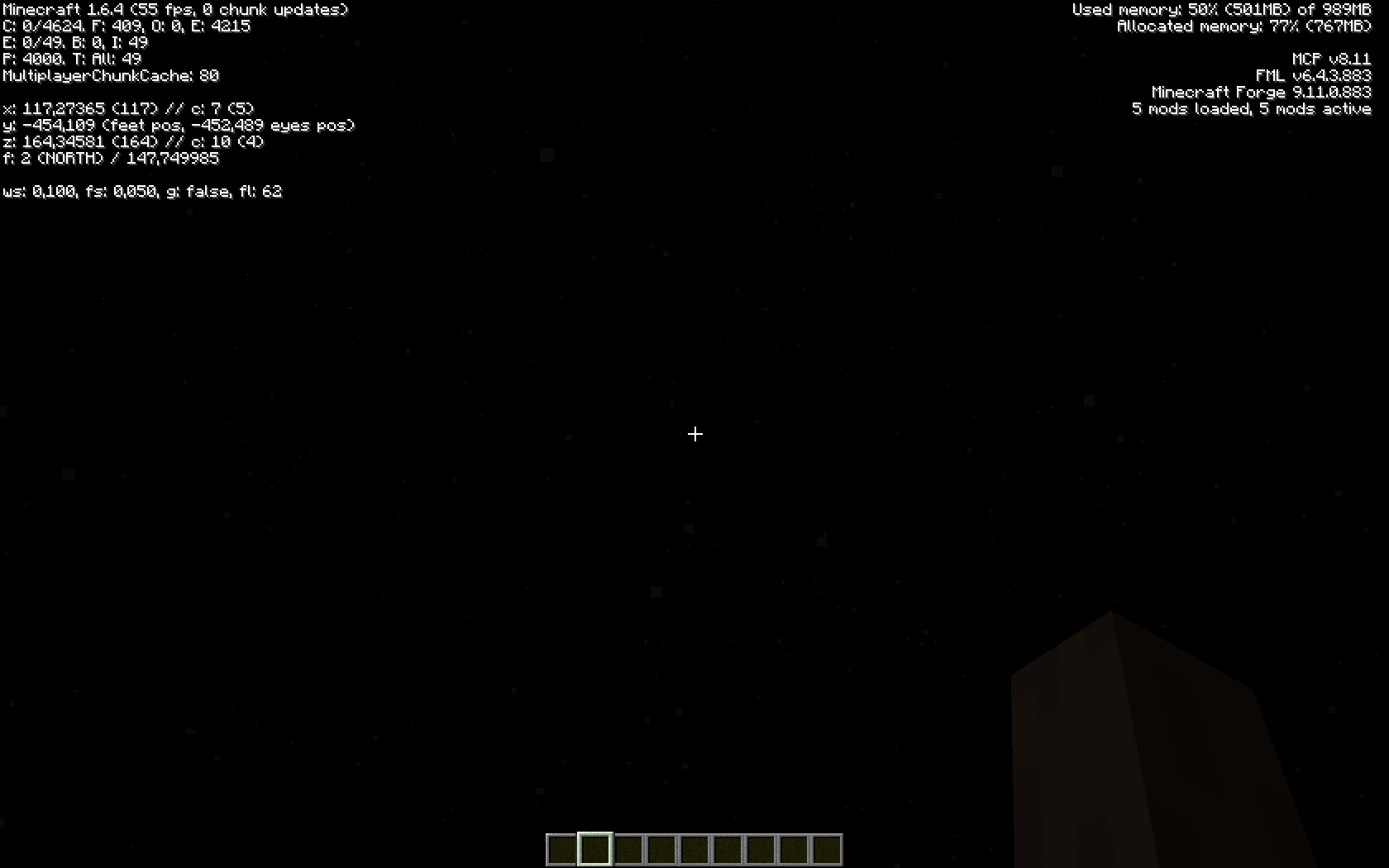 Die Leere ist der leere Raum, der sich sowohl unter der Grundgesteinschicht am Boden einer Welt (also unter Ebene 0), als auch über der maximalen Bauhöhe (256) befindet. Dies stellt den Raum außerhalb der Welt dar.