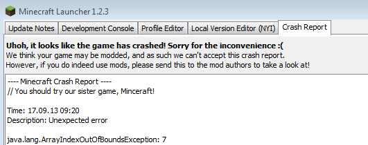 Auf jedem Crash Report erscheint zufällig einer dieser Kommentare als eine Art augenzwinkernde Entschuldigung für die Unannehmlichkeiten. Aufgrund ihrer Spruch-Form und zufälligen Erscheinung haben sie Ähnlichkeiten mit den Splash-Texten. Einige Kommentare sind Zitate und Anspielungen, viele sind aber auch einfach nur nette Entschuldigungen, ohne ein spezielles Zitat zu sein.