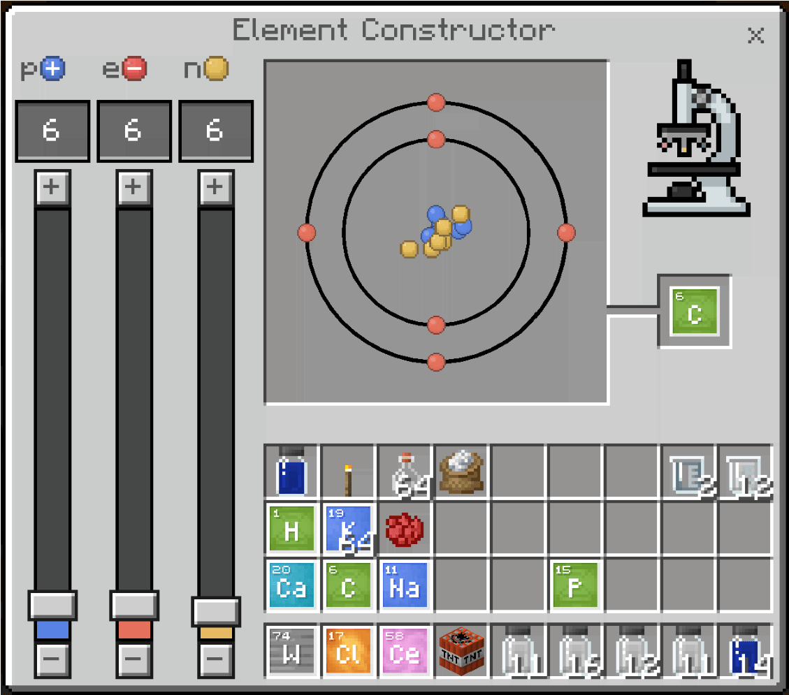 Der Elementkonstruktor ist ein in der Chemie verwendeter Block. Es ermöglicht die Konstruktion von Elementen durch Einstellen der Anzahl von Protonen, Elektronen und Neutronen.