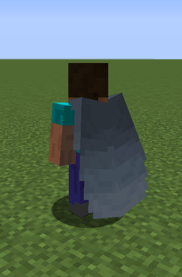 - Wenn man einen Umhang trägt, wird dieser durch die Elytren ersetzt. Daher übernehmen die Elytren sein Muster (siehe Galerie), solange man sie trägt. Umhänge können nur von Mojang (z. B. für MineCon-Teilnehmer) oder durch Mods vergeben werden.