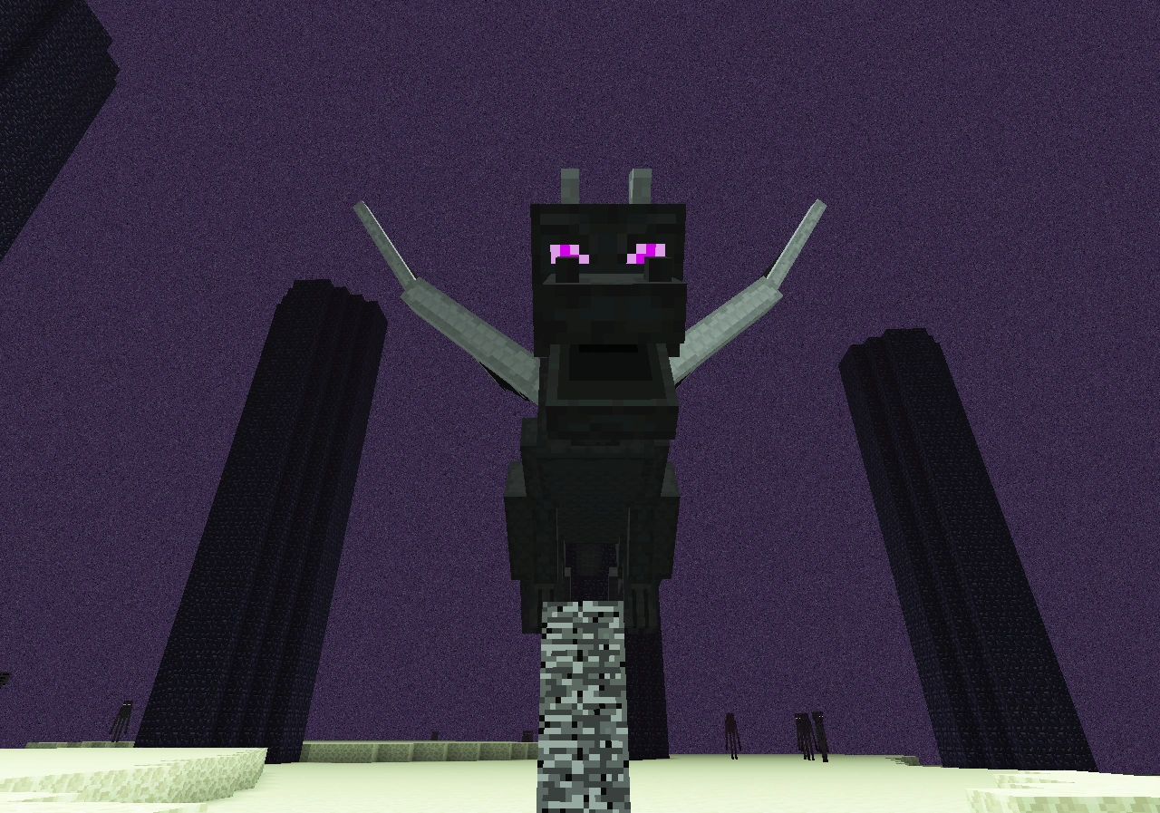 Wie gesagt, ist der Enderdrache die mächtigste Kreatur in der Minecraft-Welt. Er hat 200 Lebenspunkte, richtet mit jedem Angriff 10 Schadenspunkte an und wird durch Enderkristalle geheilt, die an der Spitze von Obsidiansäulen sitzen. Die Säulen sind im Ende verteilt. Außerdem muss sich der Spieler vor den Endermen schützen, die hier in großer Zahl vorkommen. Der Enderdrache fliegt durch Endstein, Grundgestein und Obsidian einfach so hindurch, alle anderen Materialien vernichtet er beim Durchfliegen. Dabei explodieren die Blöcke und richten Schaden beim Spieler, bei Endermen und in der Umgebung, aber nicht beim Drachen an.