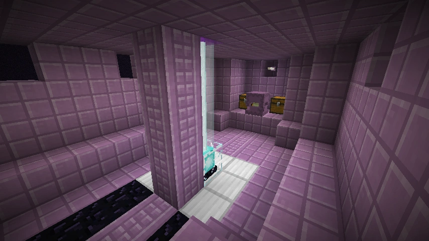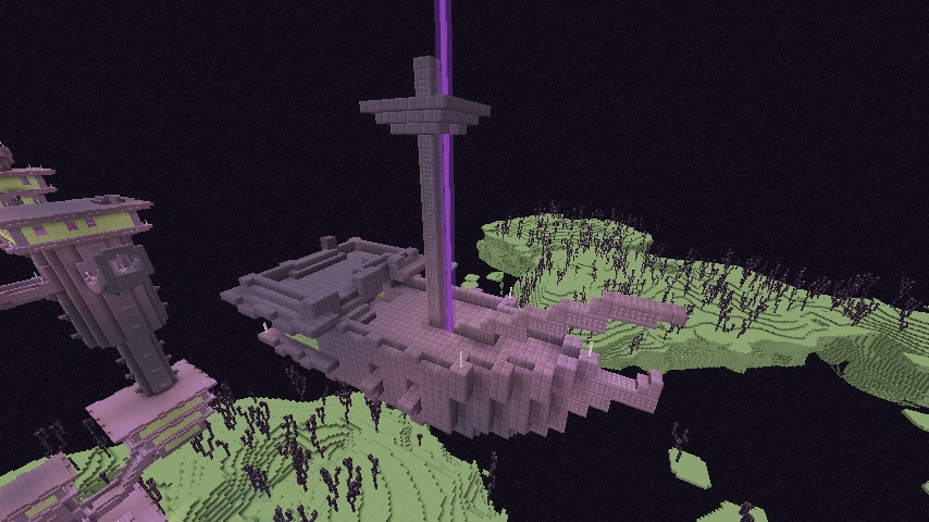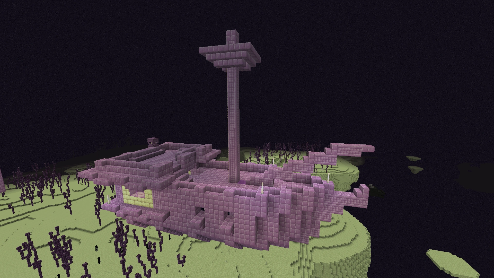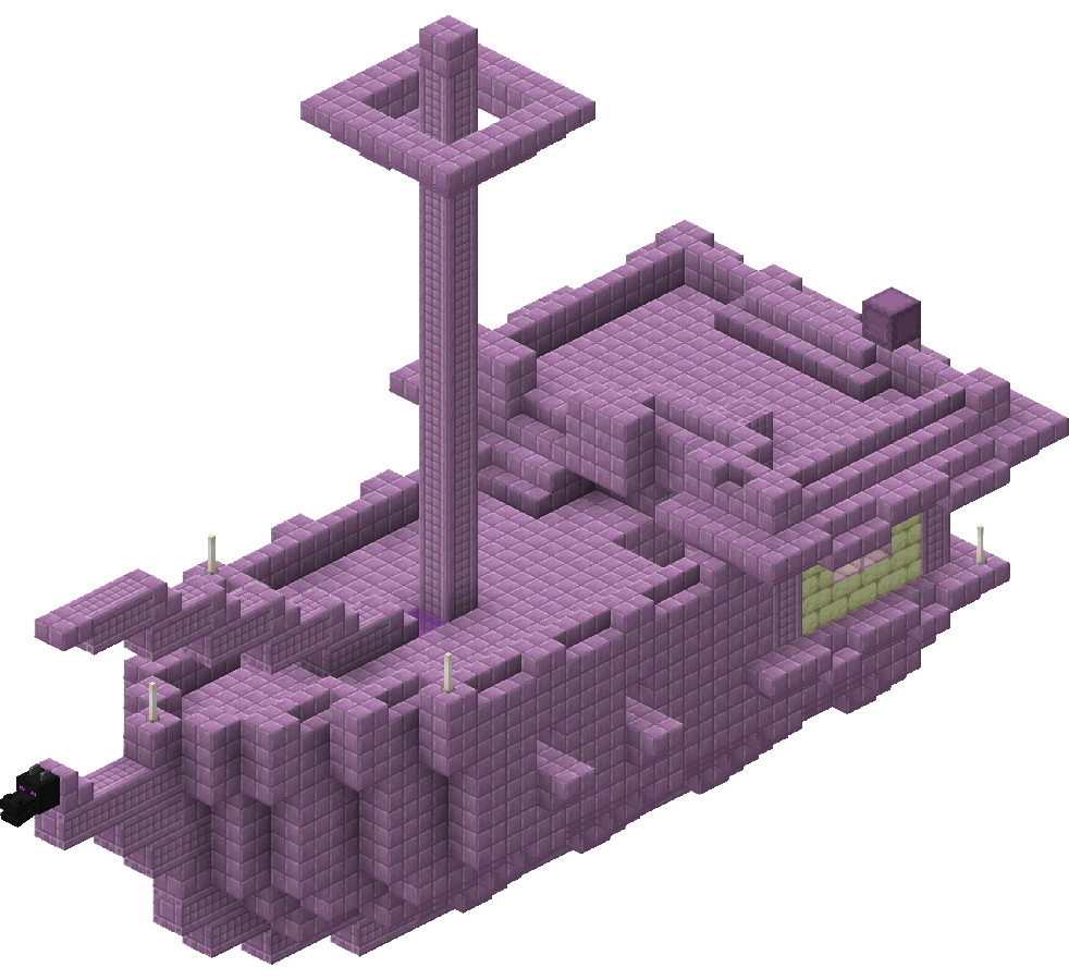 | Schiff | Selten und nur bei großen Endsiedlungen ist ein Schiff vorhanden, das in einigem Abstand von einer Brücke im Raum schwebt. Vom Brückenende kann man das Schiff mit einer Enderperle erreichen. Das Innere der Schiffe ist ziemlich klein. Es gibt einen Braustand mit zwei Tränken der Heilung. Außerdem gibt es zwei Truhen, die von einem Shulker bewacht werden. Diese enthalten sehr wertvolle Beute (einschließlich verzauberten Diamantrüstungsteilen und Eisenrüstungsteilen). Außerdem hängt dort in einem Rahmen ein Paar Elytren. Am Bug des Schiffes befindet sich ein Enderdrachenkopf. | ![]() |