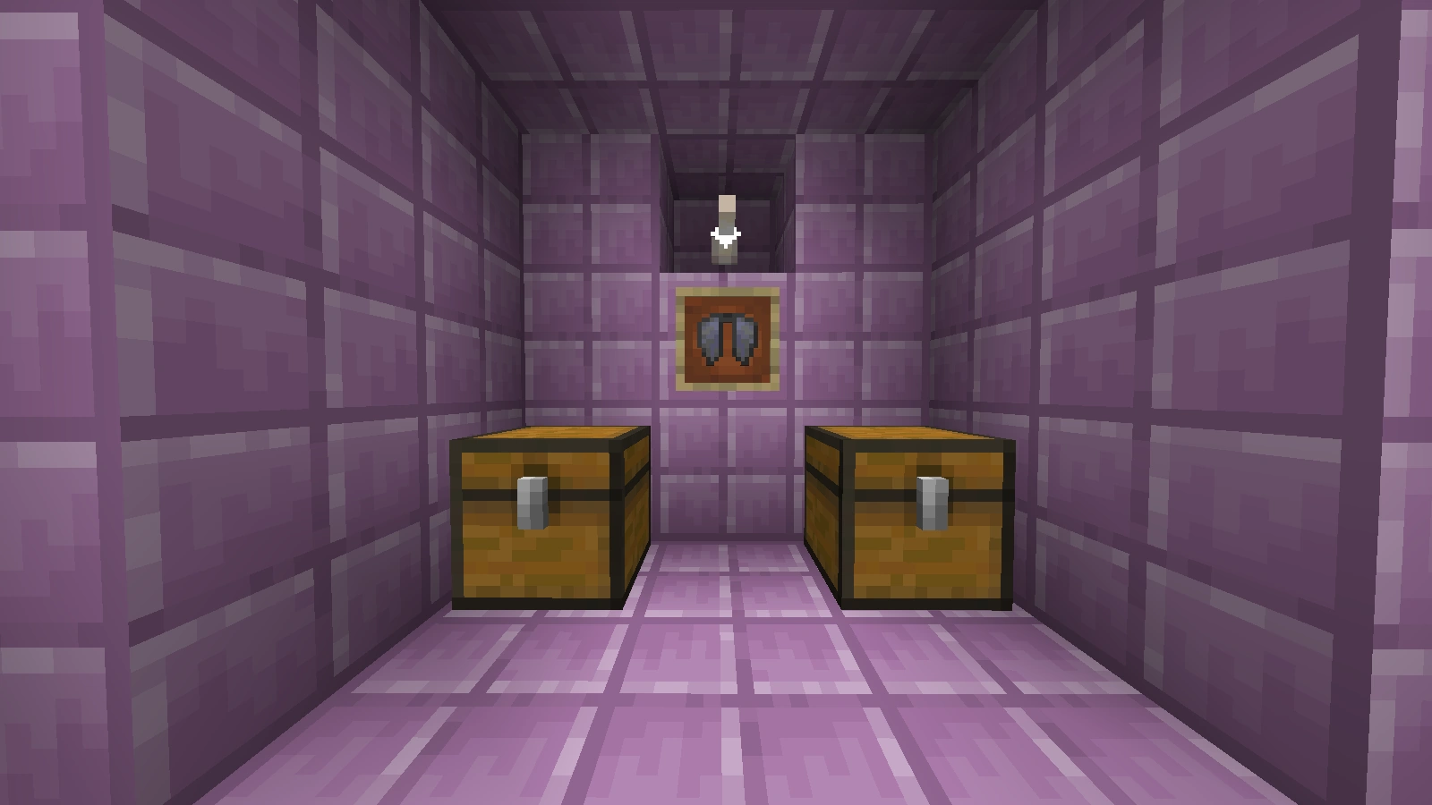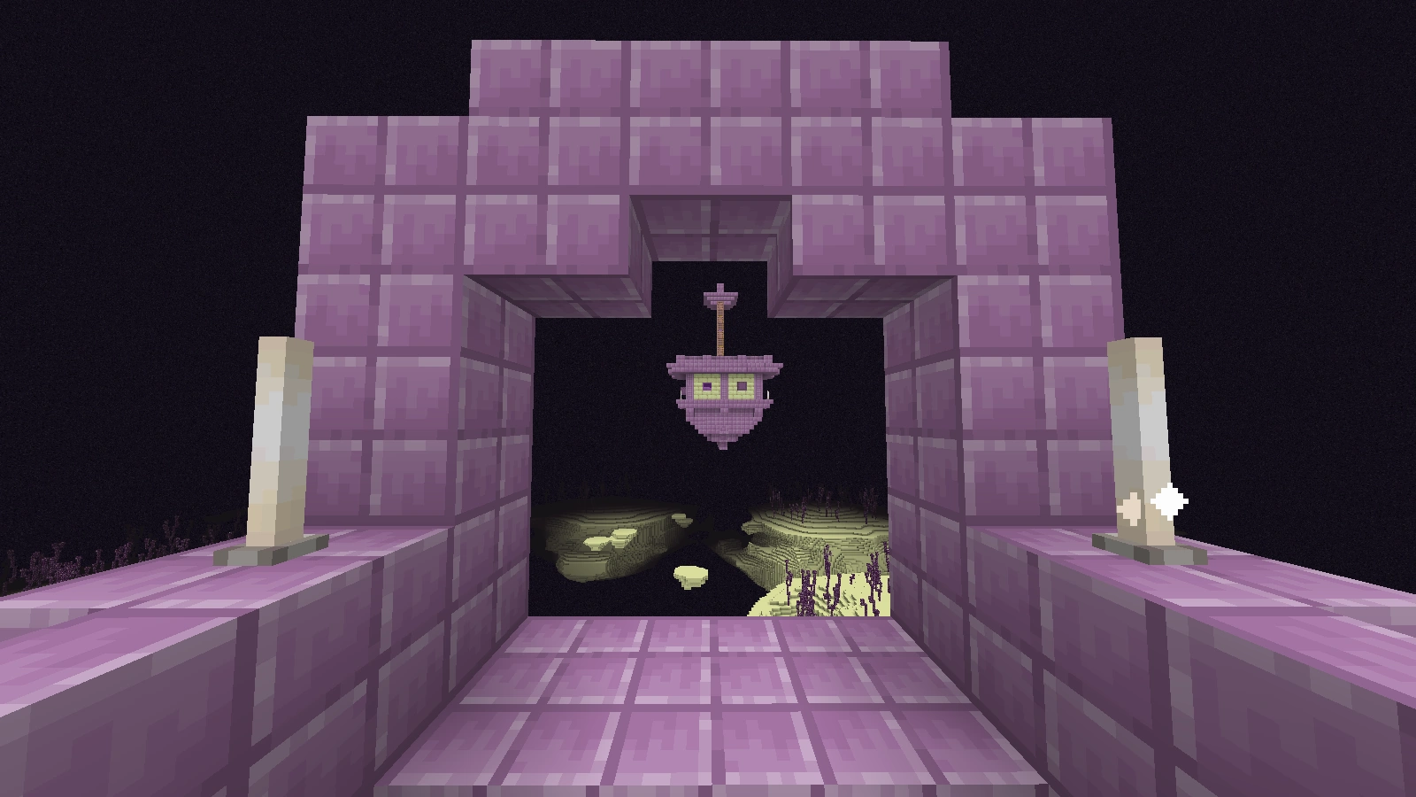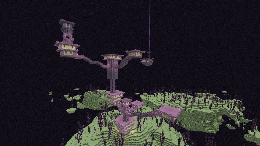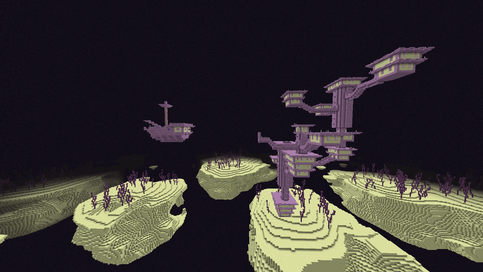 | Schiff | Selten und nur bei großen Endsiedlungen ist ein Schiff vorhanden, das in einigem Abstand von einer Brücke im Raum schwebt. Vom Brückenende kann man das Schiff mit einer Enderperle erreichen. Das Innere der Schiffe ist ziemlich klein. Es gibt einen Braustand mit zwei Tränken der Heilung. Außerdem gibt es zwei Truhen, die von einem Shulker bewacht werden. Diese enthalten sehr wertvolle Beute (einschließlich verzauberten Diamantrüstungsteilen und Eisenrüstungsteilen). Außerdem hängt dort in einem Rahmen ein Paar Elytren. Am Bug des Schiffes befindet sich ein Enderdrachenkopf. | ![]() |