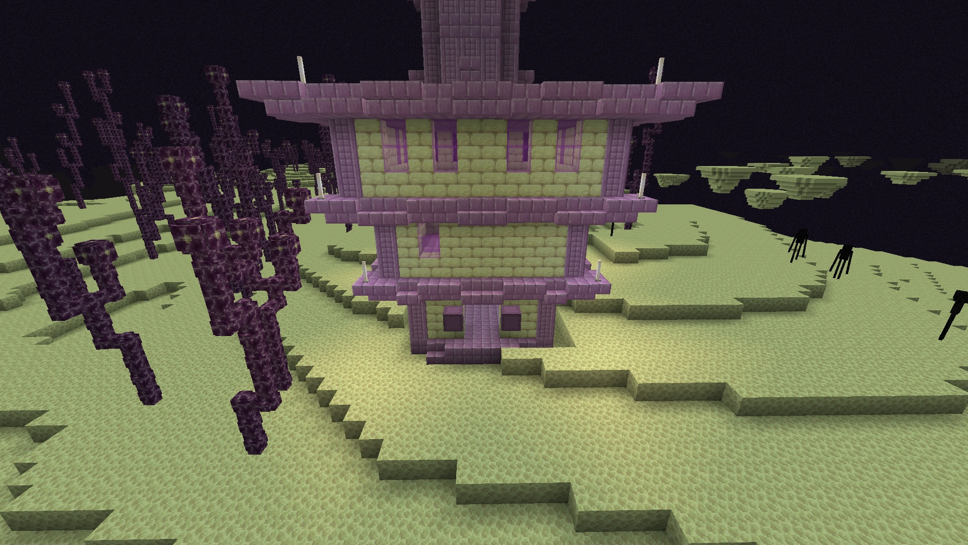 | Zweistöckiges Haus | Ein 10×10 großes Gebäude mit einer Höhe von neun Blöcken und breiterem Dach. Es hat ebenfalls schmale Fenster und zwei Shulker an der Eingangstür. Innen hat es eine zentrale Treppe, die in den zweiten Stock mit offenem Boden führt. | ![]() |