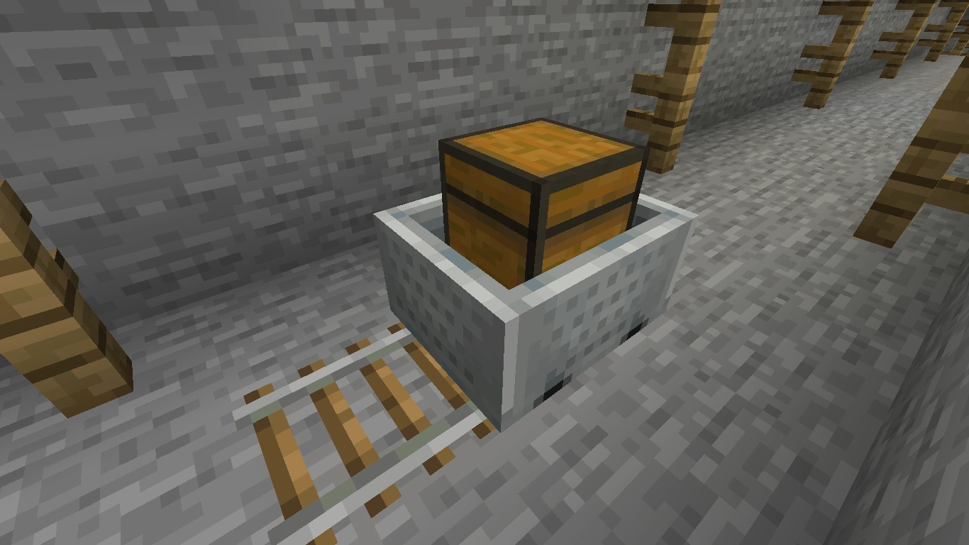 Im Inventar ist die Güterlore ein Gegenstand. Sobald sie platziert wird, wird sie nicht zum Block, sondern zum beweglichen Objekt.