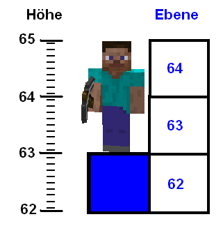 Die Höhe ist im Spiel ablesbar an der Y-Koordinate, die man im Debug-Bildschirm F3 findet. Es handelt sich um die Fußhöhe, d. h. die Oberseite des Blockes, in der man steht.