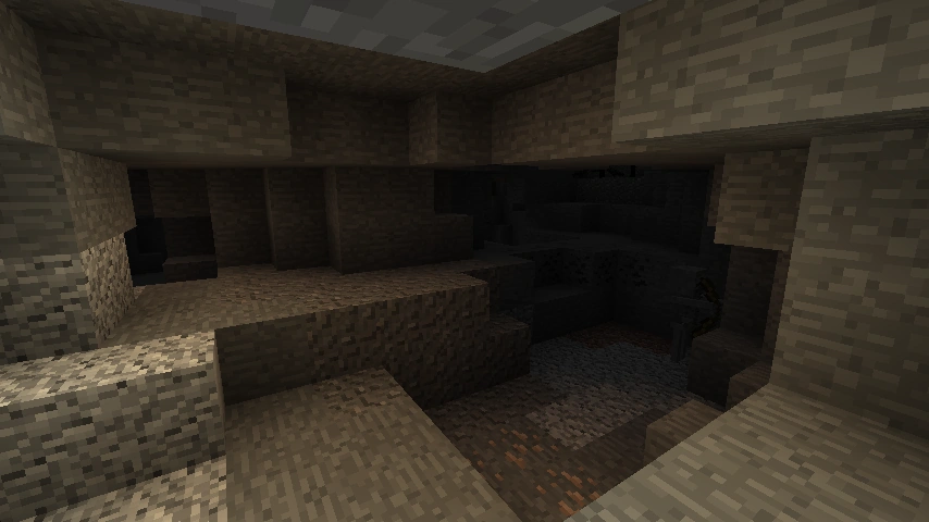 Kleine Höhlen entstehen durch Generierung eines einzelnen Ganges mit hohem Höhlennivenau. Dadurch ist der Gang von der Oberfläche aus zugänglich und hat keine Abzweigung. Je nach Tiefe findet man kleine Vorkommen an Steinkohle und Eisenerz. Seltenere Erze sind hier in der Regel nicht zu finden. |