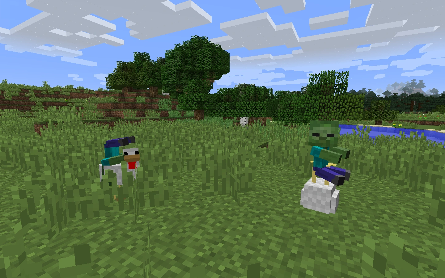 Beim Spawnen eines Zombiekindes, oder aller anderen Monster, die auf einem Huhn reiten können, prüft das Spiel außerdem, ob sich in einem 10×6×10 Blöcke großen Quader um den Spawnplatz herum ein Huhn befindet. Ist dies der Fall, besteht eine Chance von 1⁄20 (5%), dass der potenzielle Reiter auch auf das Huhn gesetzt wird und somit ein Hühnerreiter entsteht. Somit beläuft sich die Wahrscheinlichkeit für das Spawnen eines Hühnerreiters anstatt eines gewöhnlichen erwachsenen Monsters, sollte ein Huhn in der Nähe sein, auf 39⁄8000 (0,4875%).
