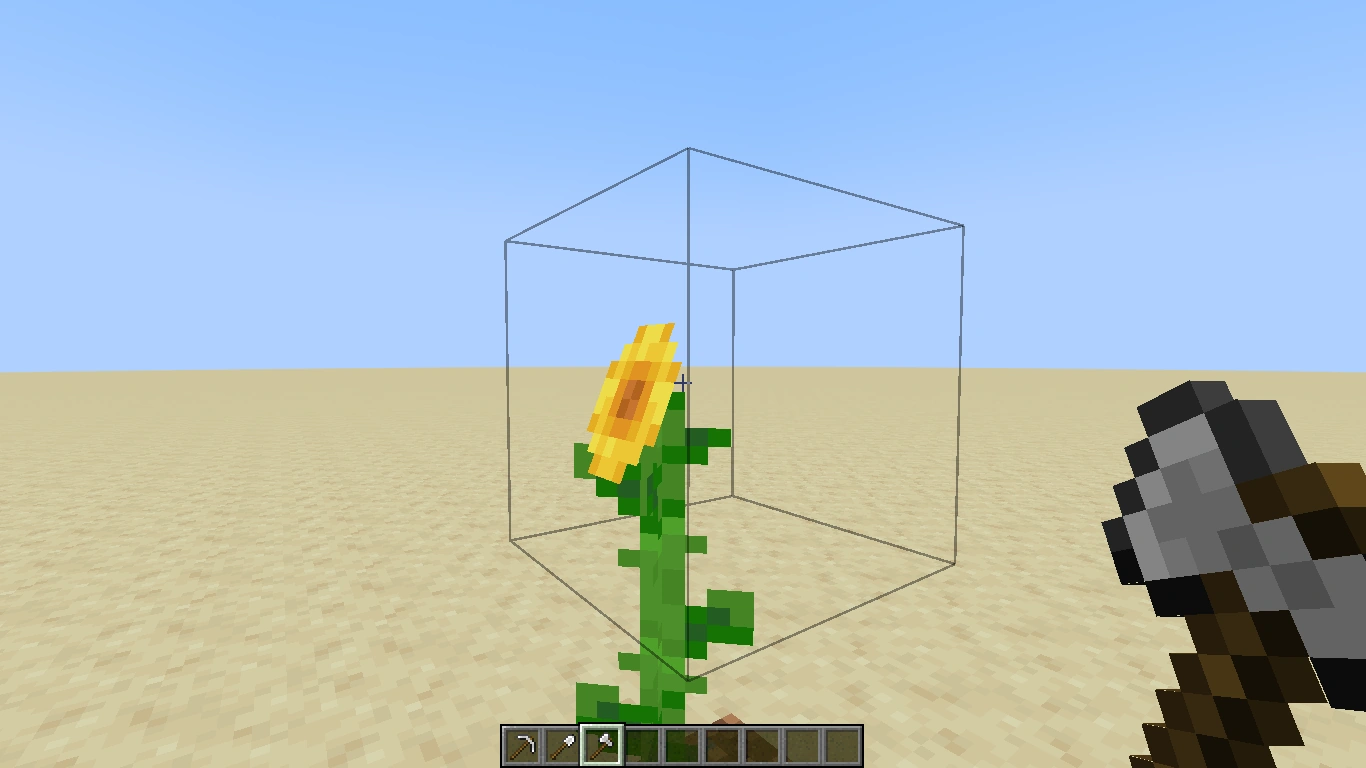 Es gibt daneben noch eine Reihe von Blöcken, deren Textur nicht das gesamte Würfelvolumen ausfüllt, wie z.B. die Sonnenblume. Da ihre Hitbox aber der gesamte Würfel ist, führt jeder Schlag auf eine Stelle dieses Würfels zum Abbau der Sonnenblume.