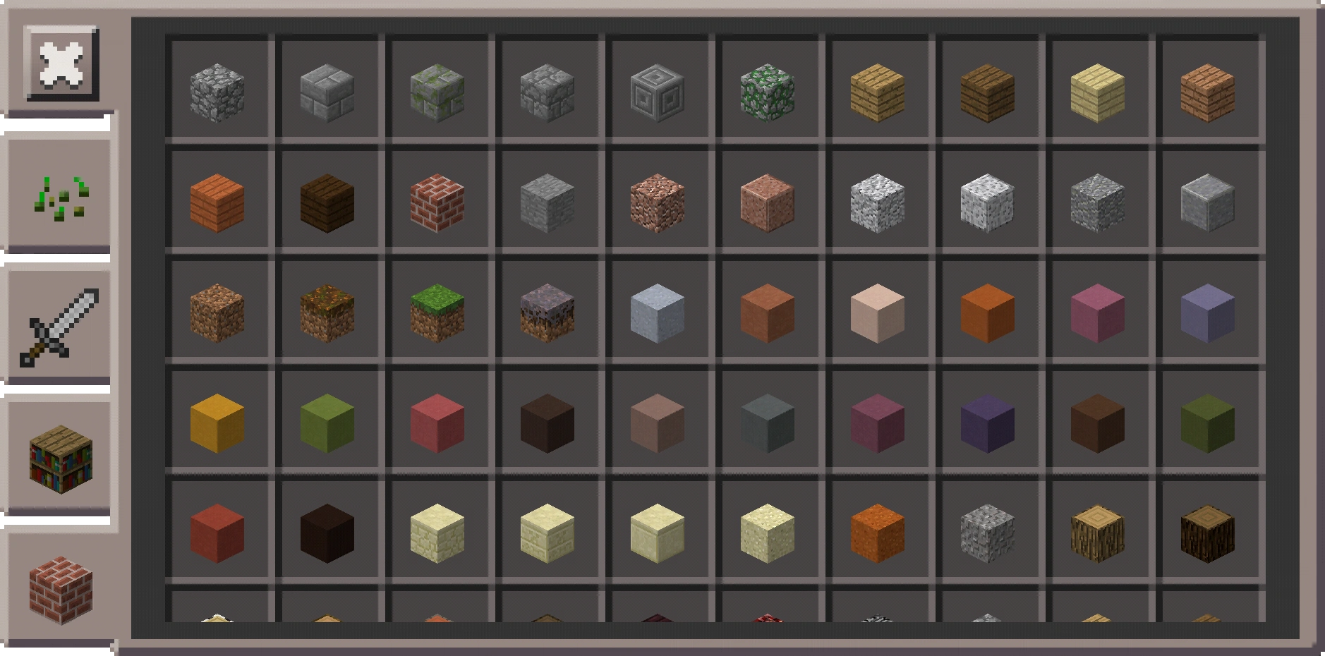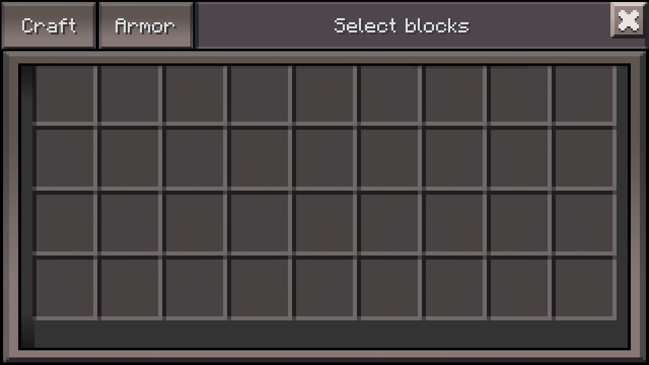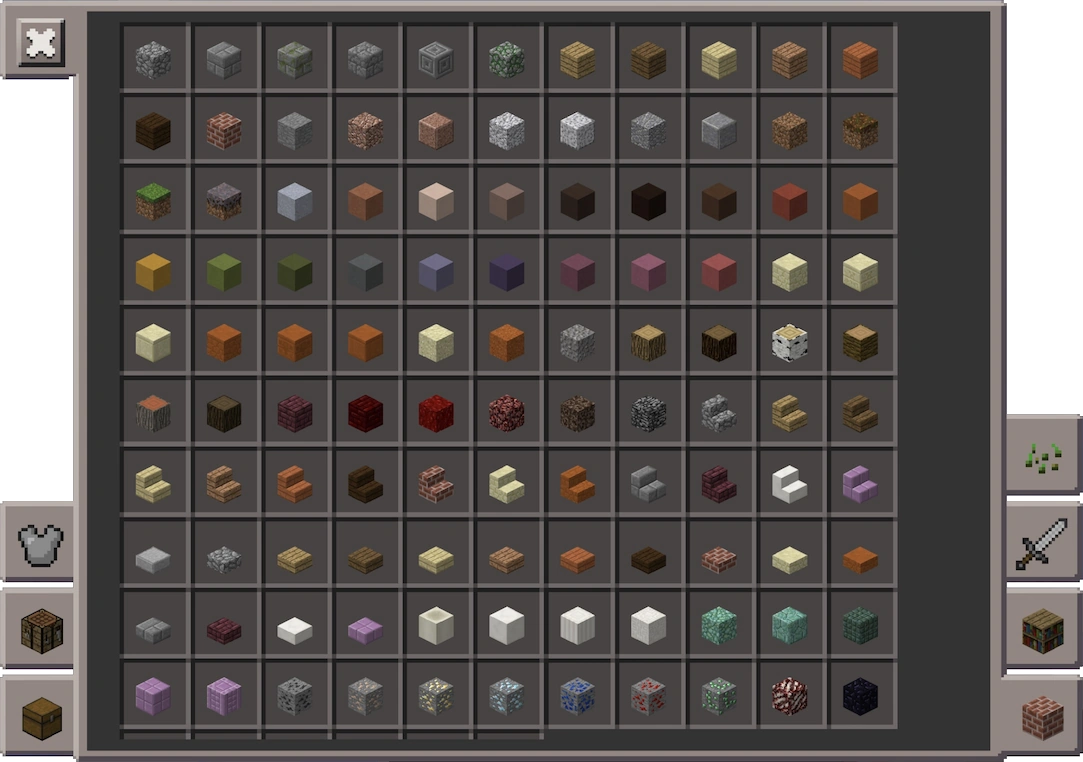 Das Inventar im Kreativmodus mit klassischer Benutzeroberfläche, dessen Aufbau und Design sich deutlich von dem in der Java Edition genutzten Inventar abhebt, zudem lässt sich der linke Teil einklappen, so dass das Inventar dem des Überlebensmodus entspricht.