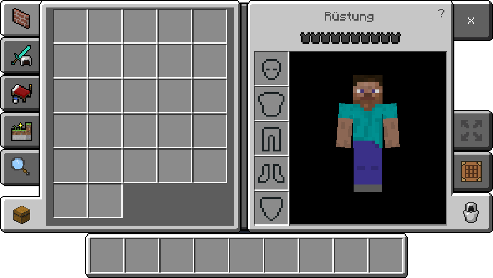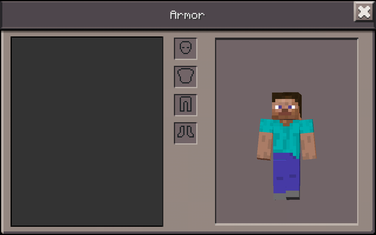 Der separate Inventarbildschirm für Rüstungen ist nur in der Bedrock Edition bei aktivierter "Pocket"-UI verfügbar. Das Rüstungsinventar ist fast genauso aufgebaut, wie das Rüstungssystem der Java Edition, es sieht nur etwas anders aus. Von hier aus kann ebenfalls die Zweithand belegt werden, die in der Bedrock Edition allerdings nur eingeschränkt genutzt werden kann. Auf der linken Seite ist wie gewohnt das gesamte Spielerinventar verfügbar, alternativ kann das Rezeptbuch eingeblendet werden.