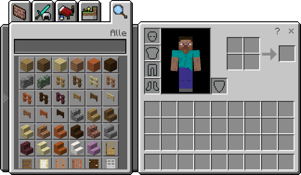Funktioniert wie das Handwerkssystem ohne Werkbank. Rezeptbuch und Spielerinventar sind als Kategorien auf der linken Seite auswählbar, rechts kann neben dem Handwerksfeld auch die ausgerüstete Rüstung eingeblendet und gewechselt werden.