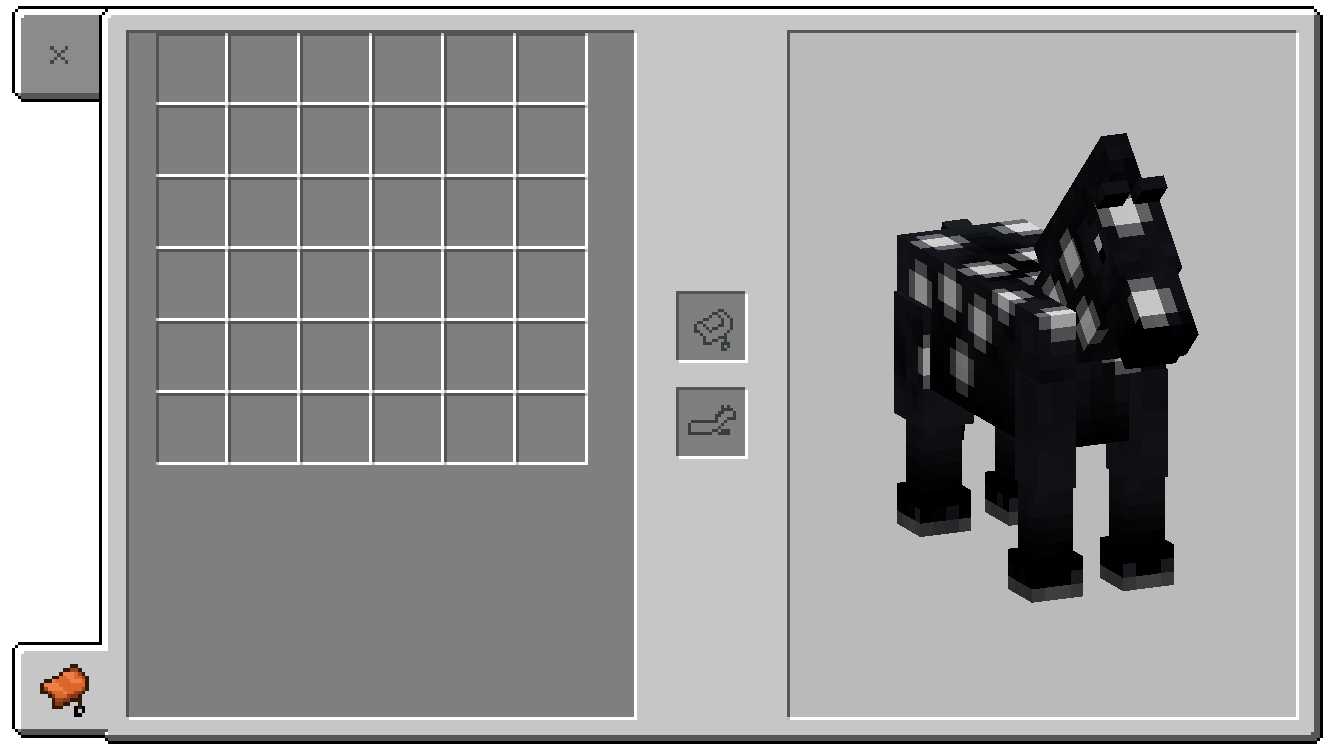 Auf der linken Seite befindet sich das Spielerinventar, auf der rechten sieht man eine Ansicht des Pferds. In der Mitte gibt es zwei Felder: In das obere kann man einen Sattel hineinlegen und in das untere kann man da Pferd mit einer Pferderüstung ausstatten.