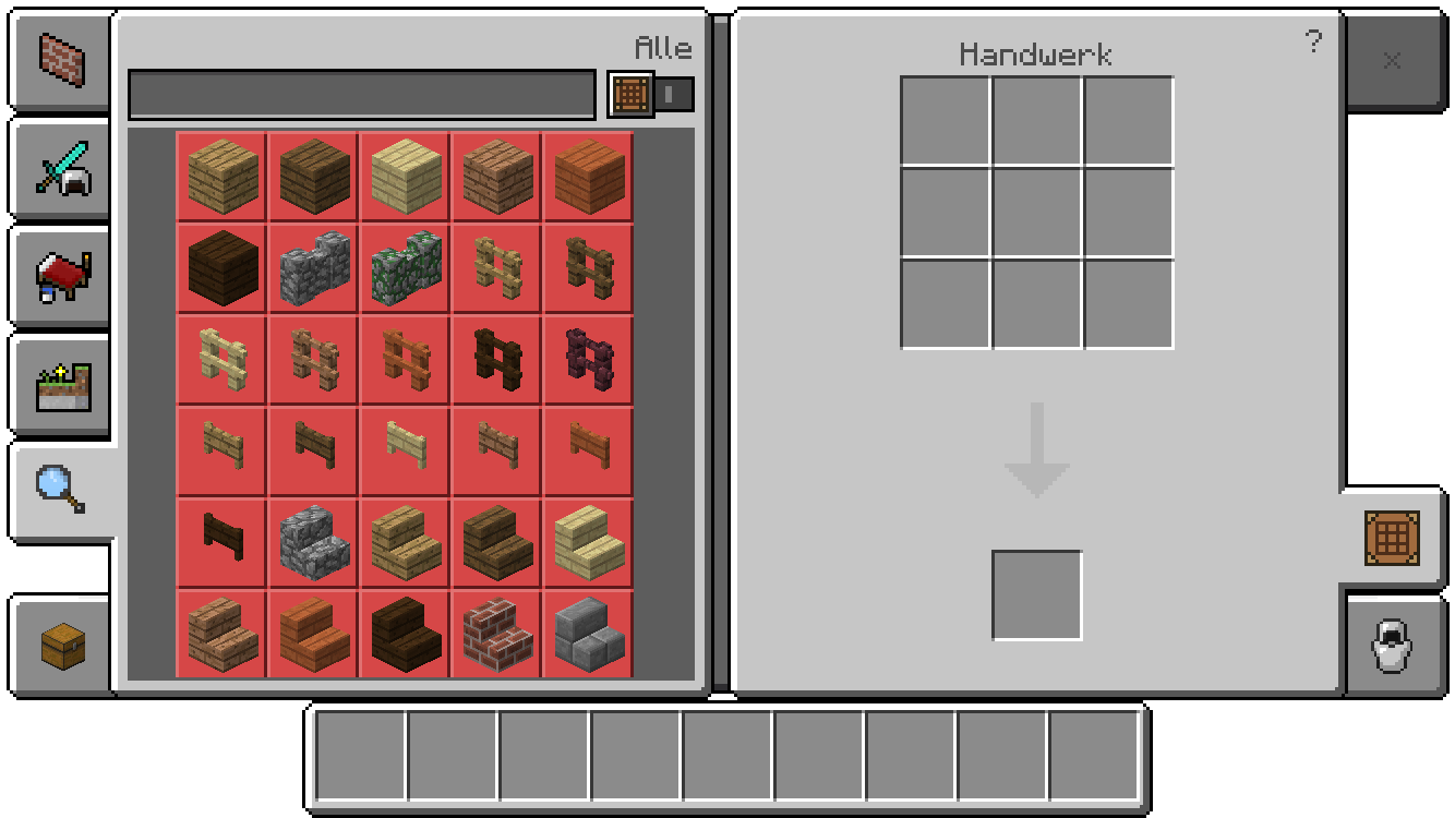 Funktioniert wie das Handwerkssystem ohne Werkbank. Rezeptbuch und Spielerinventar sind als Kategorien auf der linken Seite auswählbar, rechts kann neben dem Handwerksfeld auch die ausgerüstete Rüstung eingeblendet und gewechselt werden.