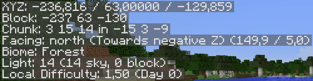 Screenshot der Debug-Informationen mit Koordinaten xyz und Facing.
