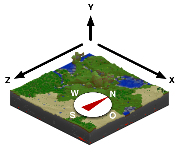 X-, Y- und Z-Koordinaten auf einer Minecraft-Welt.