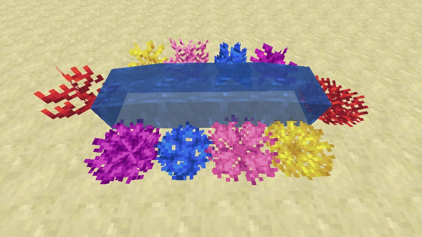 - Korallenfächer können im Wasser und an Land auf und an den Seiten eines Blocks platziert werden. Dadurch sind sie vielseitiger als Korallen, die nur auf Blockoberseiten platziert werden können. An Blockunterseiten können weder Korallen noch Korallenfächer platziert werden.