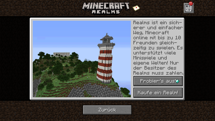 Das Menü zeigt eine Liste aller Realms, in die man eingeladen wurde bzw. die man selbst gemietet hat. Das Erhalten einer Einladung bzw. das Mieten eines Realms entspricht dem Hinzufügen eines Servers im Menü/Mehrspieler. Bei jedem Server zeigt ein kleines Lämpchen den Status an: offen, geschlossen, gesperrt, läuft bald ab, abgelaufen. Wenn der Besitzer eines Realm ein Minispiel eingestellt hat, blinkt die Zeile unter dem Weltnamen und zeigt dort den Namen des Minispiels an.