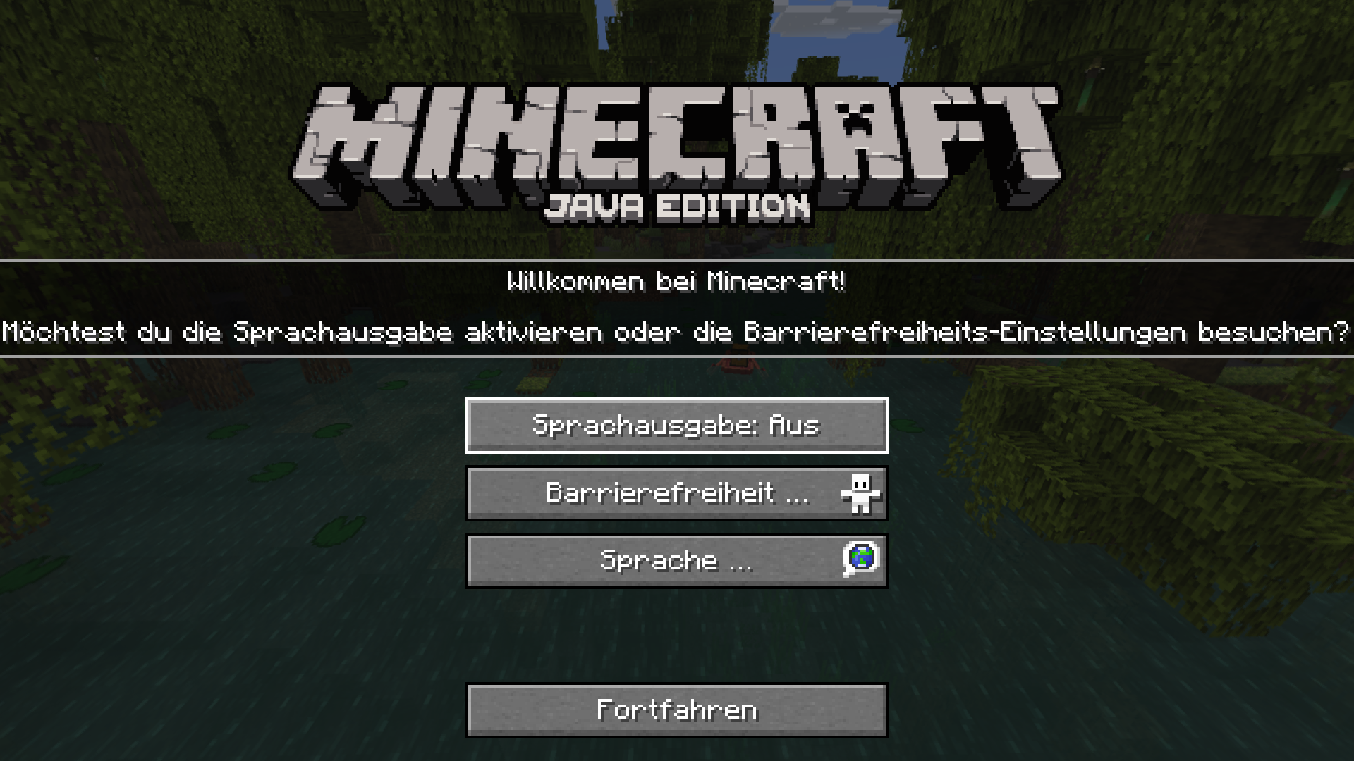 Willkommen bei Minecraft! Möchtest du die Sprachausgabe aktivieren oder die Barrierefreiheits-Einstellungen besuchen?