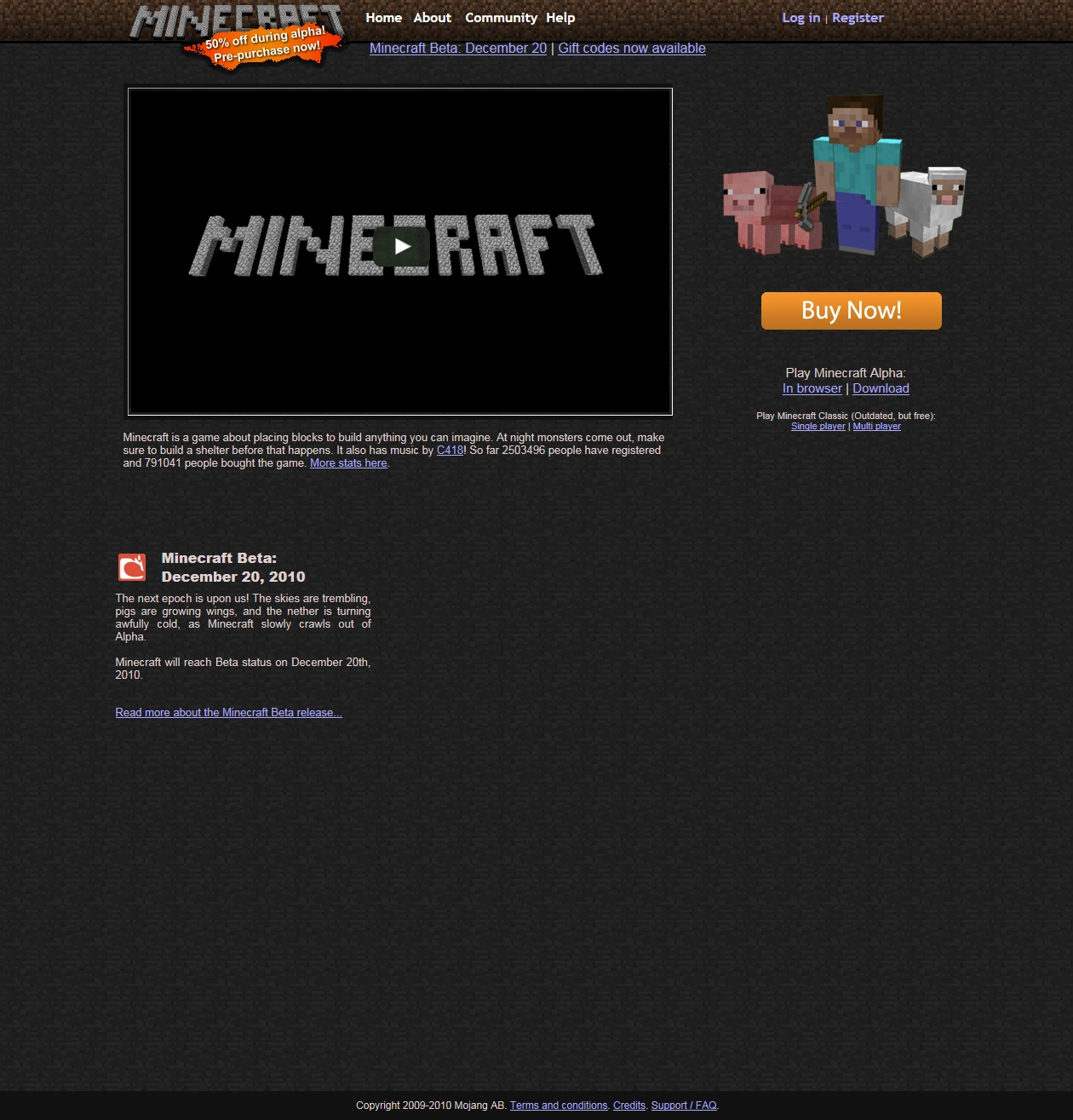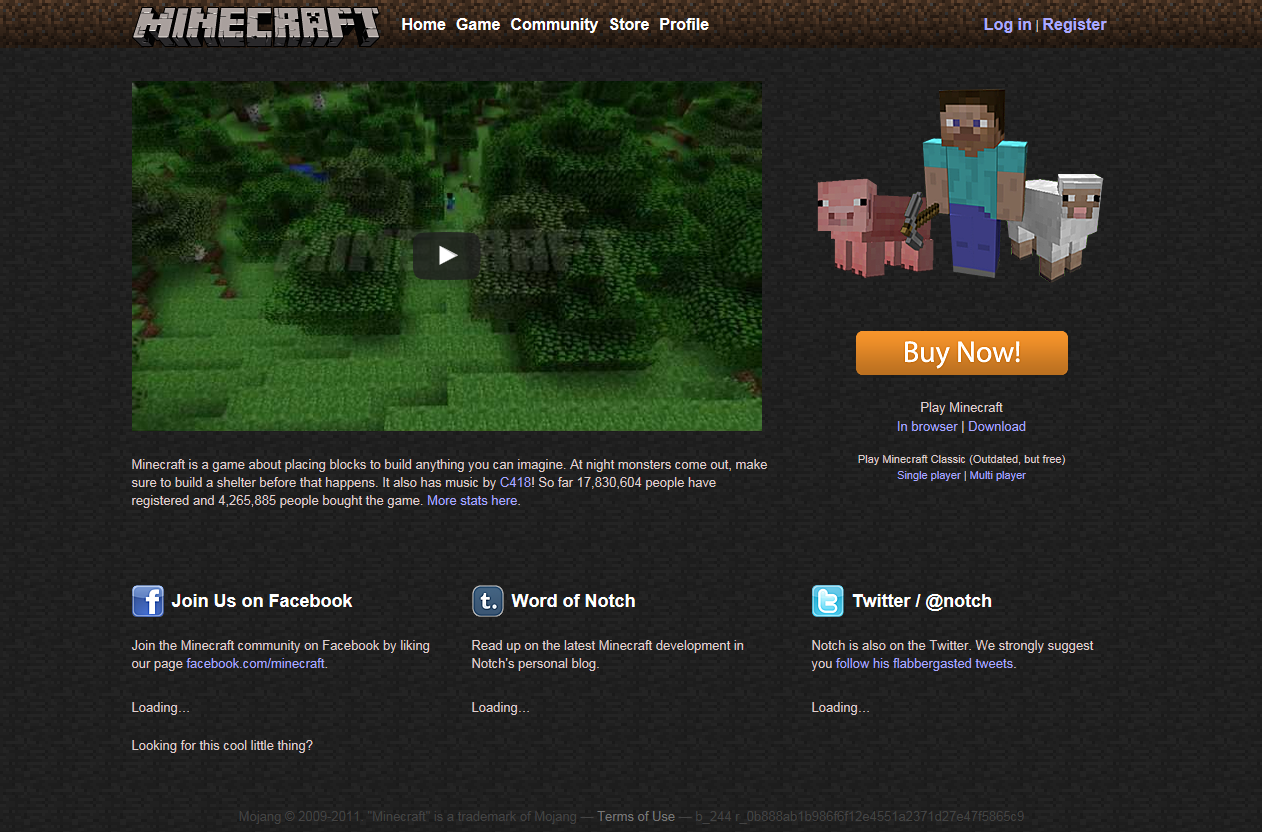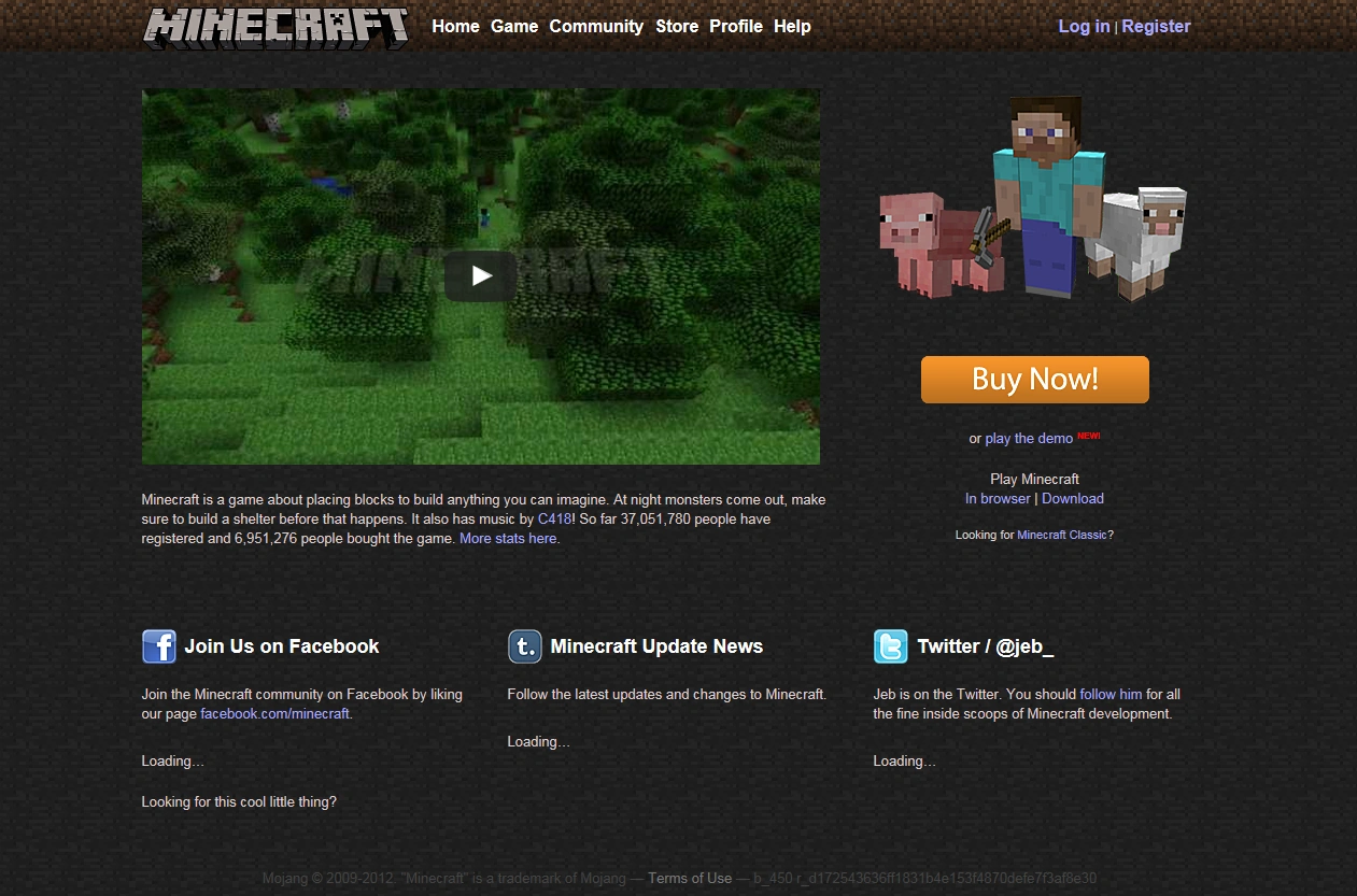 Die Startseite von minecraft.net besteht aus dem Minecraft Logo und dem Official Minecraft Trailer (YouTube). Unter dem Video ist eine sehr kurze Beschreibung von Minecraft. Auf der rechten Seite ist ein Bild von einem Spieler mit einer Spitzhacke, stehend vor einem Schwein und einem Schaf.