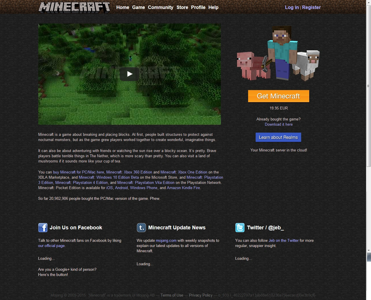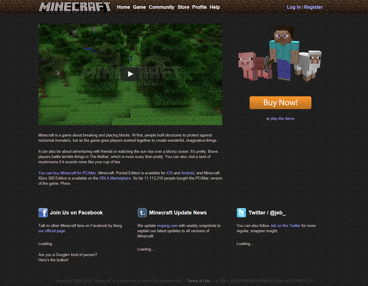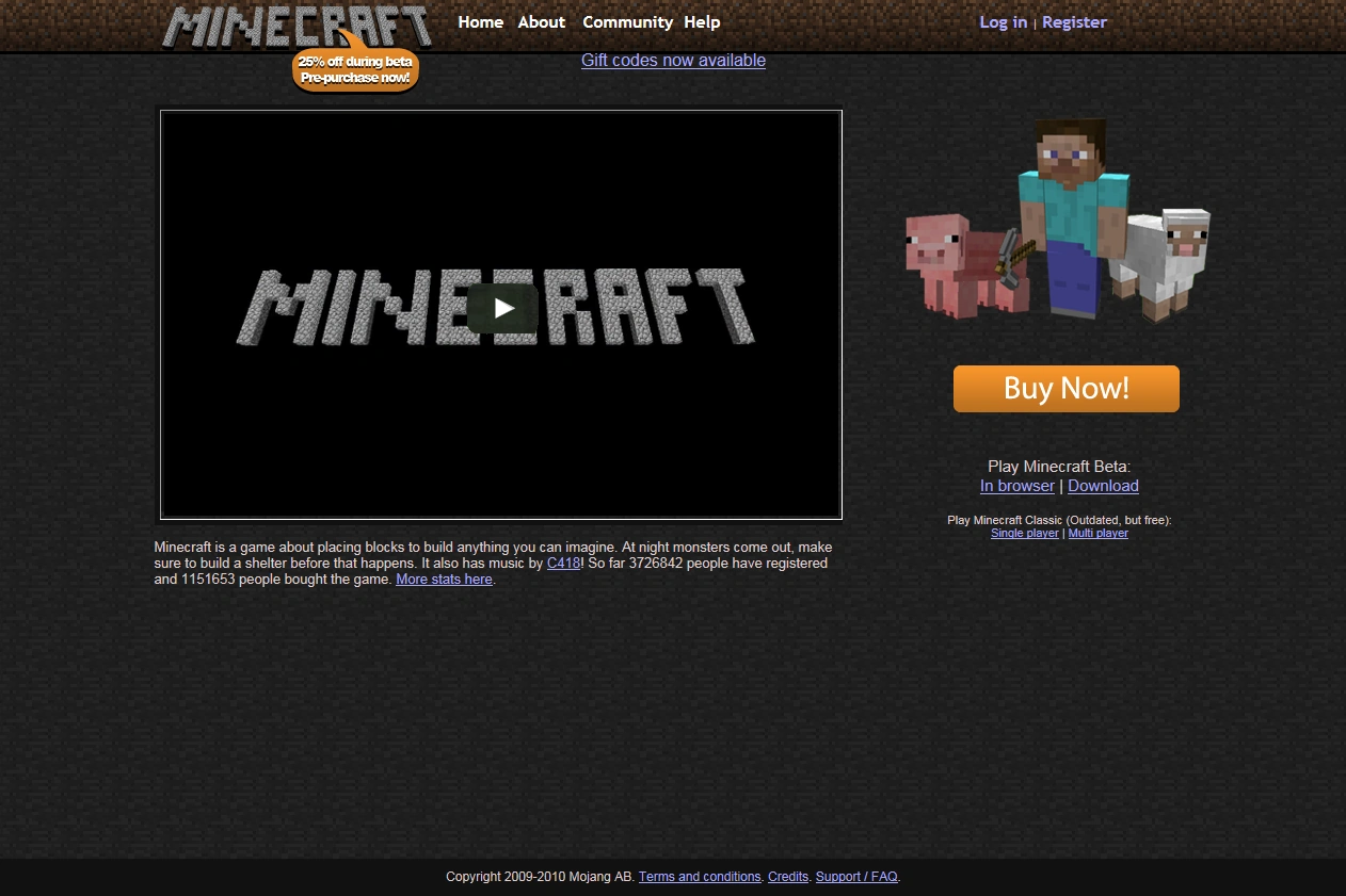 Die Startseite von minecraft.net besteht aus dem Minecraft Logo und dem Official Minecraft Trailer (YouTube). Unter dem Video ist eine sehr kurze Beschreibung von Minecraft. Auf der rechten Seite ist ein Bild von einem Spieler mit einer Spitzhacke, stehend vor einem Schwein und einem Schaf.