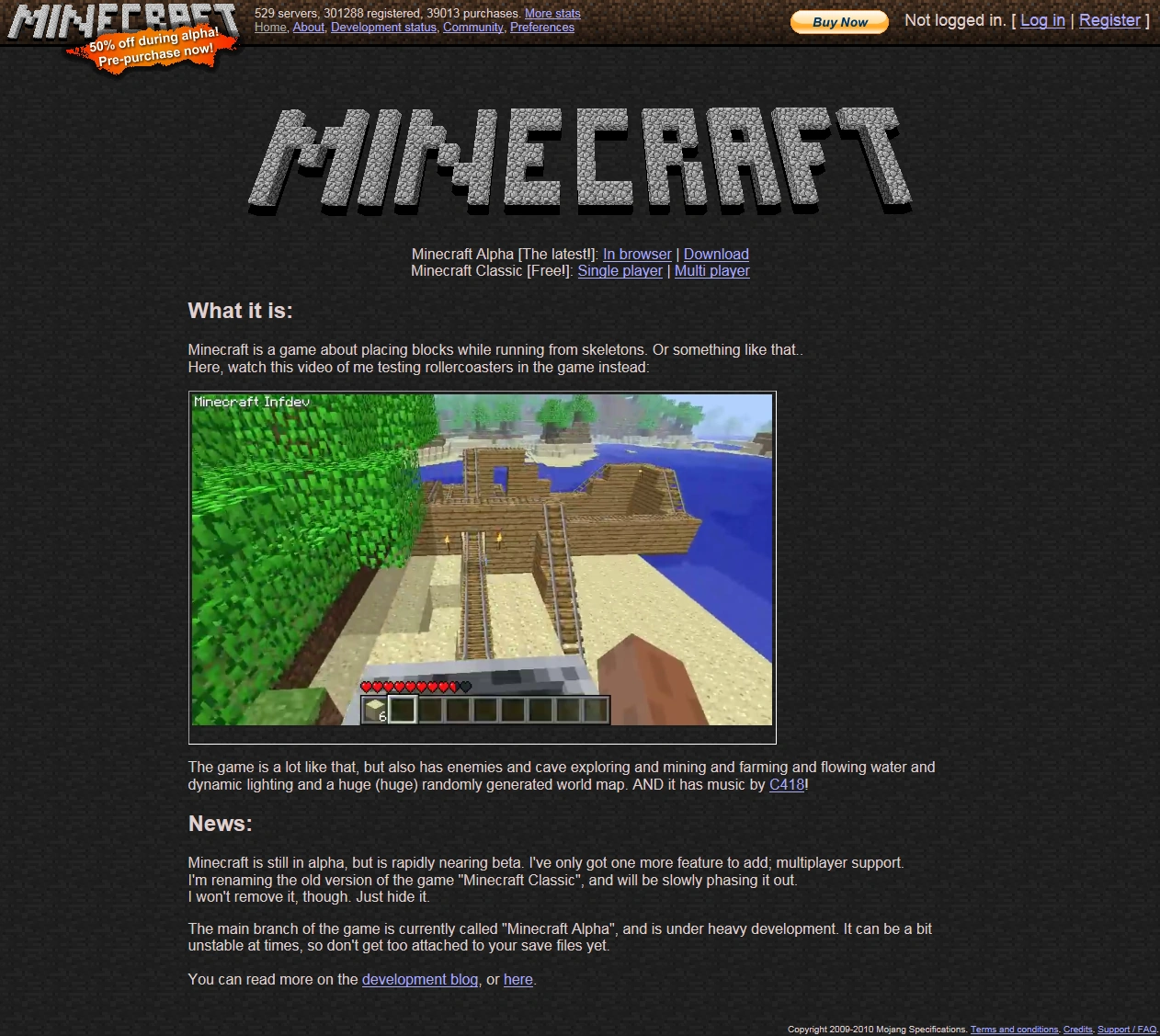 Die Webseite minecraft.net wurde von Markus Persson am 18. Mai 2009 für sein neu entwickeltes Spiel registriert. Die Webadresse minecraft.com war schon vergeben, sie gehört seit Juli 2003 einer australischen Minenfirma.
