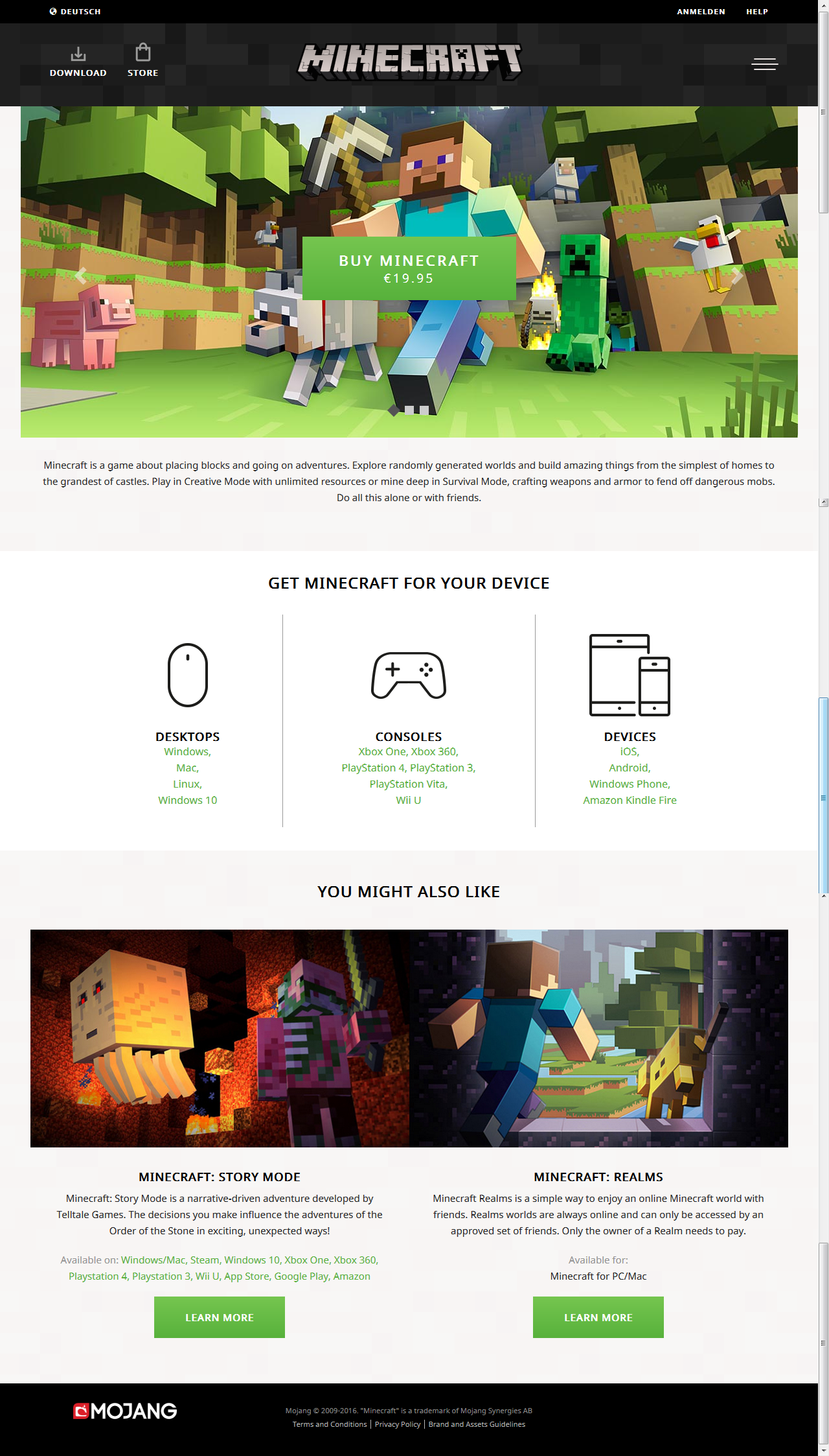 Am Fuß der Webseite sind Verlinkungen zu mojang.com und den Mojang-Lizenzbedingungen. Darunter die Möglichkeit zum Ändern der Sprache für die Webseite und Links zu verschiedenen Microsoft-Webseiten (Besitzer von Mojang).