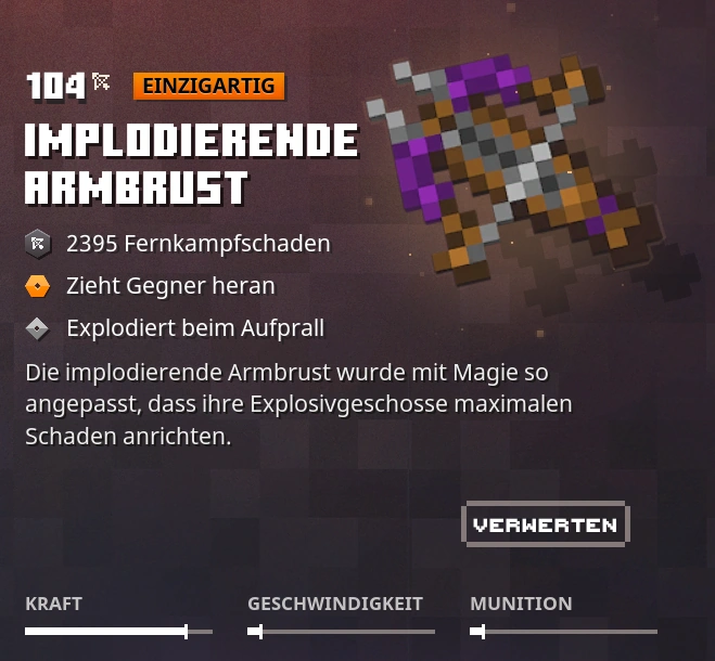 Die Implodierende Armbrust ist eine einzigartige Fernkampfwaffe in Minecraft Dungeons. Sie ist eine Variante der Explosionsarmbrust.