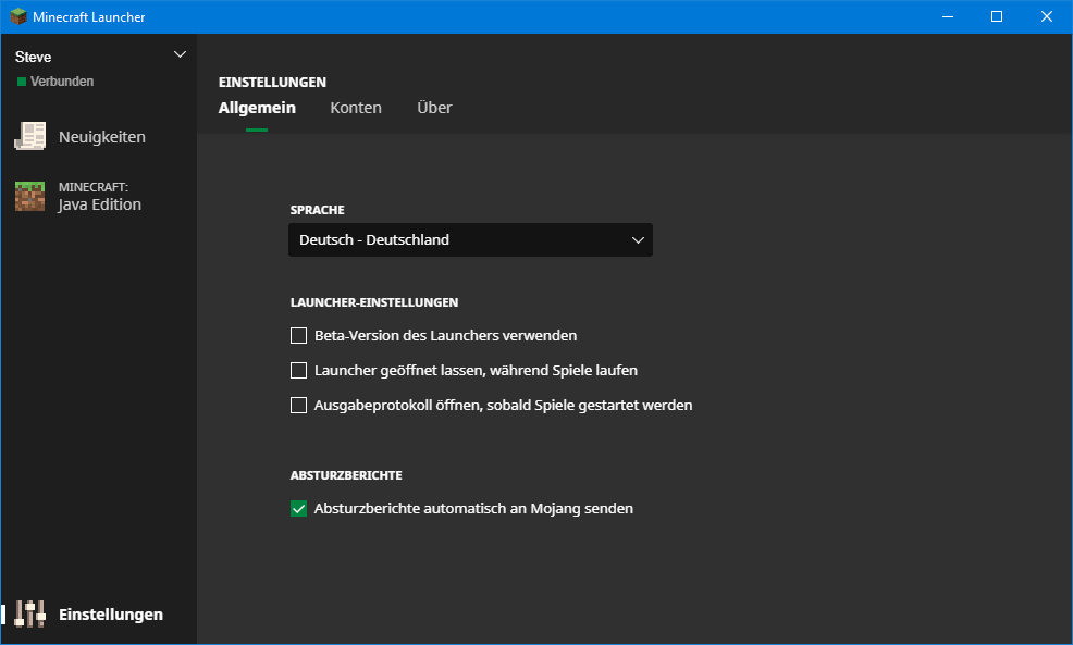 - Einstellungen: Hier kann man festlegen, ob der Launcher geöffnet bleiben soll, während das Spiel läuft, ob man das Ausgabeprotokoll in einem eigenen Fenster haben möchte, wie die Profile sortiert werden sollen und ob der Crashreport, der bei einem Spielabsturz erzeugt wird, mit Rückfrage automatisch an Mojang verschickt werden soll.