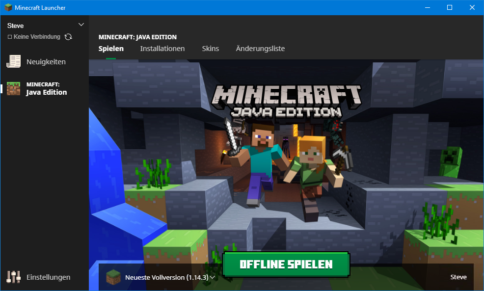 - In der Mitte unten zeigt der große, grüne Knopf die aktuell eingestellte Minecraft-Version an. Mit einem Klick auf Spielen (oder Offline spielen falls keine Internetverbindung besteht) wird der Minecraft-Client gestartet, das ist die Hauptaufgabe des Launchers.