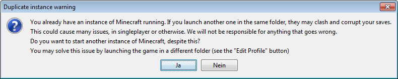 - Es ist auch möglich, das Spiel mehrfach zu starten und parallel mit mehreren Accounts zu spielen. Der Launcher gibt eine Warnung aus, wenn man das Spiel mit demselben Account mehrfach startet oder wenn man mehrfach auf dieselbe Welt (Spielordner) zugreift.