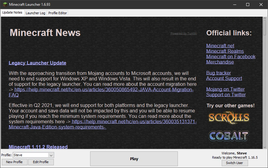 - Unten rechts führt ein Klick auf das Mojang-Logo ebenfalls zur Webseite minecraft.net.
