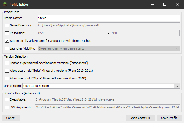 - Profile: Hier konfiguriert man den Minecraft-Client. Wird der Launcher von mehreren Spielern verwendet, kann hier jeder Spieler seine bevorzugten Einstellungen vornehmen. Die Sortierung der Profile ist im Hauptmenüpunkt Einstellungen wählbar. Man kann ein neues Profil manuell anlegen oder ein bereits bestehendes Profil über den "Copy"-Button als Vorlage für ein neues Profil nutzen. Jedem Profil kann man einen Minecraft-Block als Icon zuordnen. Der Name ist frei wählbar. Die Version wird aus einer Liste ausgewählt, auch den passenden Server kann man hier herunterladen. In der Profil-Liste kann man einstellen, ob man auch Entwicklungsversionen und historische Versionen (Beta, Alpha, Classic, Pre-Classic) auswählen möchte. Für jedes Profil kann man einen anderen Spielordner einstellen (Standard ist .minecraft) und mit dem grünen Pfeil diesen Ordner direkt öffnen. Die Auflösung gibt die Größe des Client-Fensters und damit auch der Screenshots an. Möchte man das Fenster im Vollbildmodus öffnen, gibt man das nicht hier, sondern im Client im Menü/Optionen/Grafikeinstellungen ein.