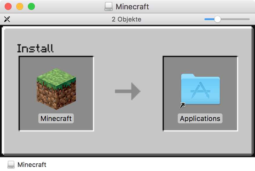 Öffnet man die Datei, erscheint ein Fenster, in dem man lediglich die links zu findende Minecraft.app-Datei in den rechten Ordner namens Applications ziehen muss. Daraufhin wird die Minecraft-Datei in diesen Ordner verschoben, der sich unter /Applications finden lässt. Dies ist der Standardordner für alle Anwendungen unter macOS, diese werden dann auch im Launchpad angezeigt.