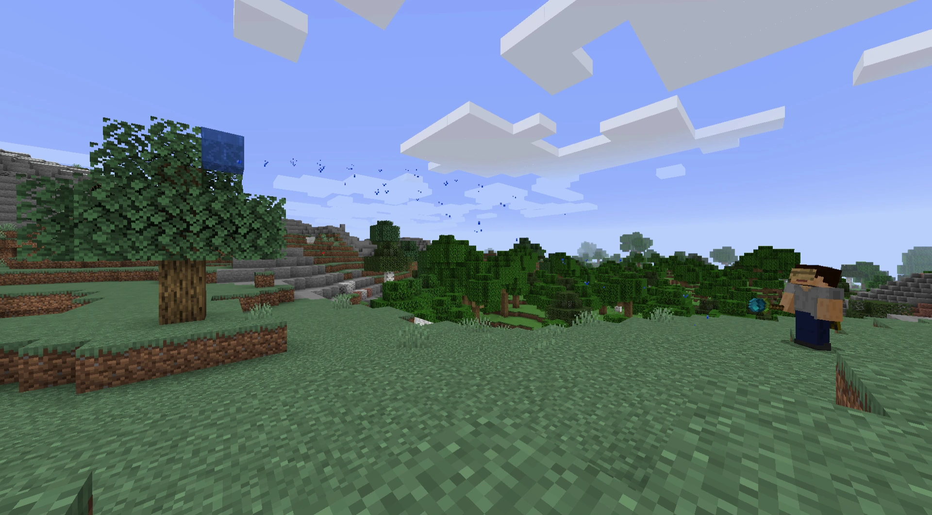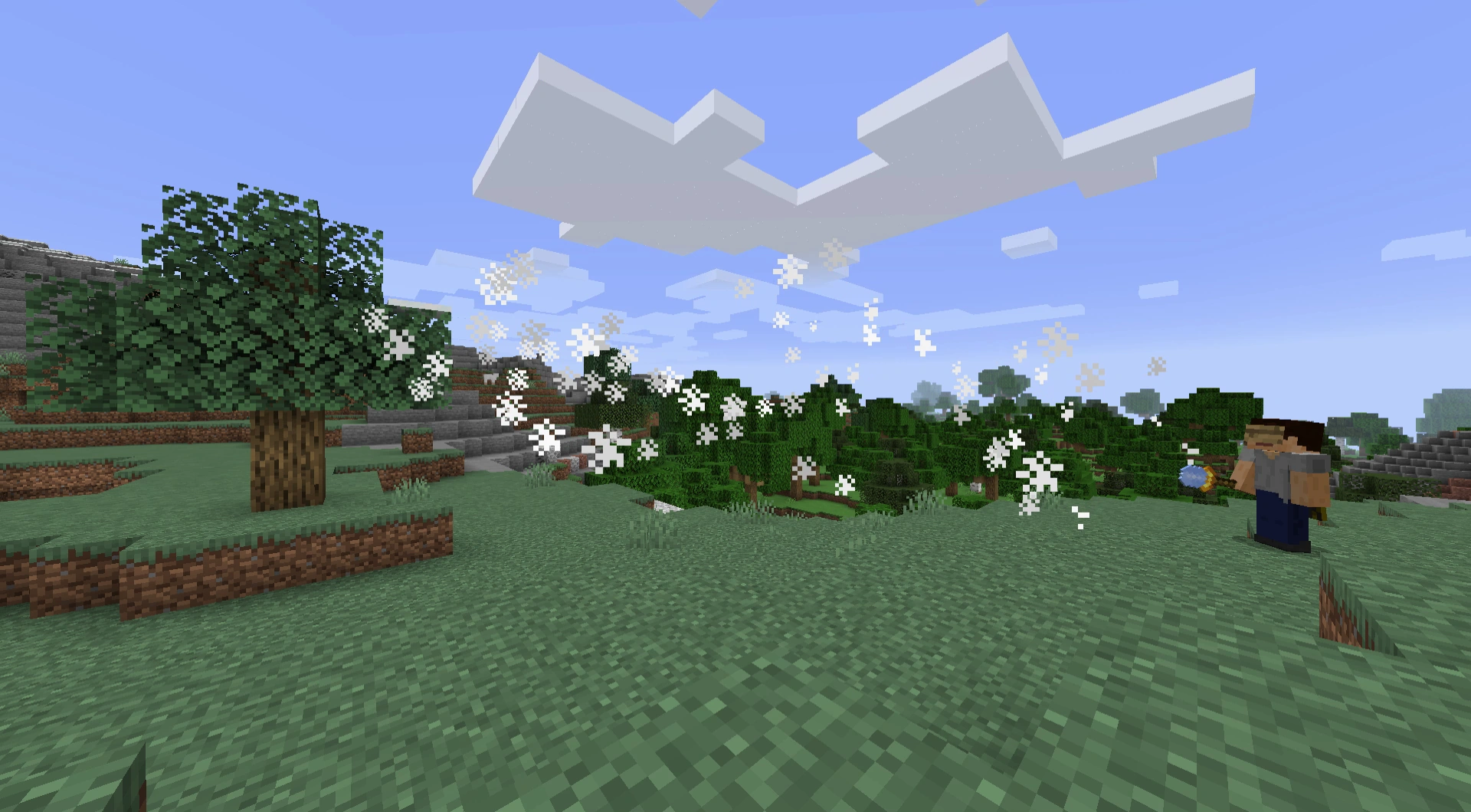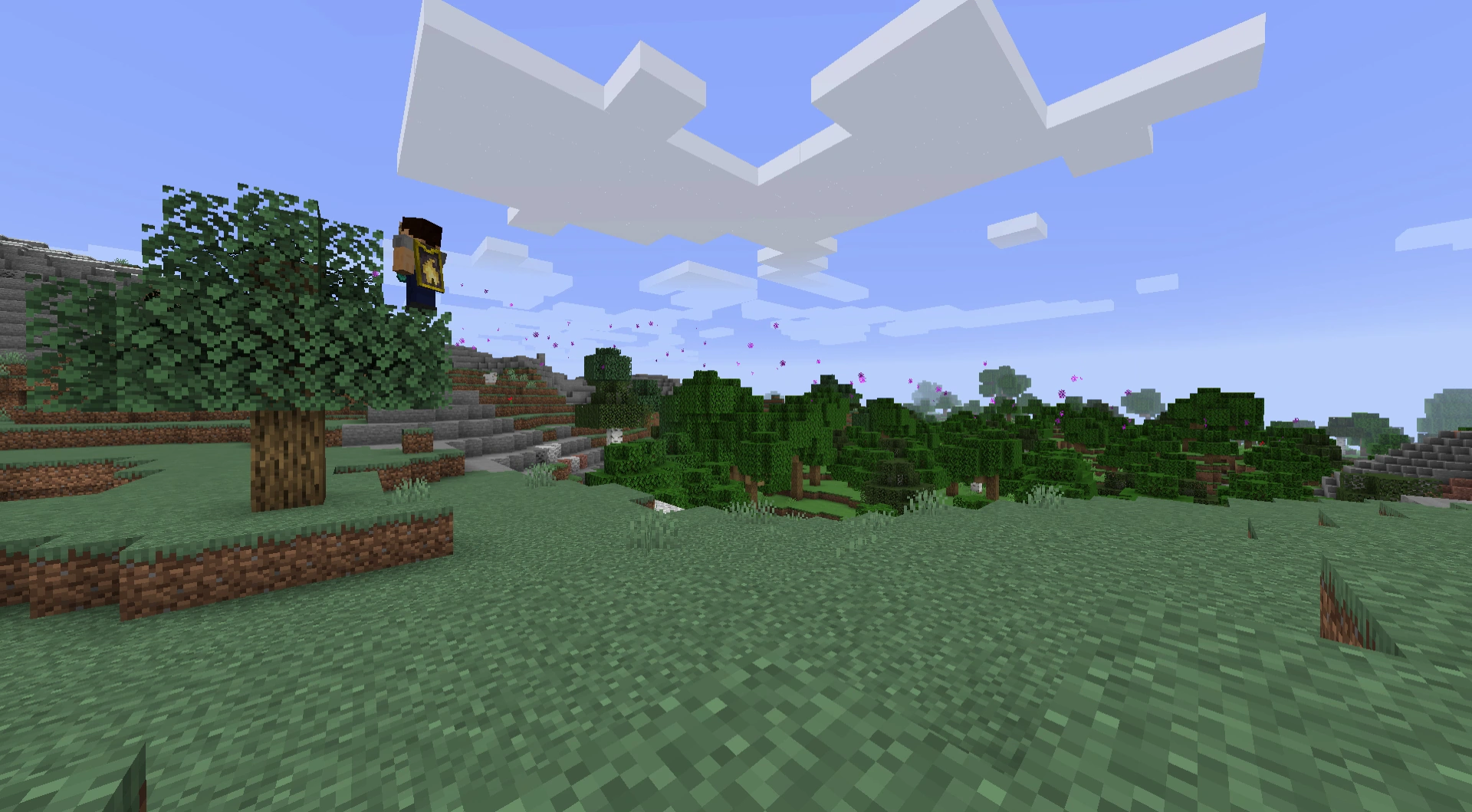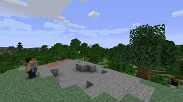 Ein Spieler teleportiert sich mit seinem Enderstab auf einen Baum