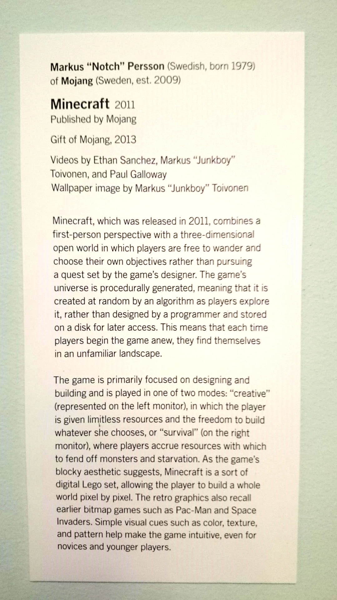 | “ | Markus "Notch" Persson (Schwede, geb. 1979) von Mojang (Schweden, gegr. 2009) Minecraft 2011 Herausgegeben von Mojang Geschenk von Mojang 2013 Videos von Ethan Sanchez, Markus "Junkboy" Toivonen und Paul Galloway Hintergrundbild von Markus "Junkboy" Toivonen Minecraft, das 2011 fertiggestellt wurde, kombiniert die Ego-Perspektive mit einer dreidimensionalen offenen Welt, in der die Spieler frei herumlaufen und ihren eigenen Zielen nachgehen können, statt einer vom Spieldesigner vorgegebenen Geschichte zu folgen. Die Spielwelt wird prozedural generiert, d.h. sie wird durch einen Algorithmus zufällig erzeugt, während die Spieler sie erforschen, und nicht von einem Programmierer auf eine Diskette gespeichert, um dann im Spiel gezeigt zu werden. Dadurch finden sich die Spieler jedesmal in einer unbekannten Landschaft wieder, wenn sie eine neue Welt starten. Hauptsächlich konzentriert sich das Spiel auf das Gestalten und Bauen und wird in einem von zwei Modi gespielt: "kreativ" (auf dem linken Monitor zu sehen), bei dem der Spieler unbegrenzte Ressourcen hat und bauen kann, was er möchte, sowie "überleben" (auf dem rechten Monitor), wo Spieler Ressourcen ansammeln, während sie gegen Monster und Hunger ankämpfen. Wie die blockige Ästhetik des Spiels nahelegt, ist Minecraft eine Art digitales Lego, das dem Spieler ermöglicht, Pixel für Pixel eine ganze Welt aufzubauen. Die Retro-Grafik erinnert außerdem an frühere Bitmap-Spiele wie Pac-Man und Space Invaders. Die Verwendung einfacher visueller Elemente wie Farbe, Textur und Muster machen das Spiel selbst für Anfänger und jüngere Spieler leicht bedienbar. |