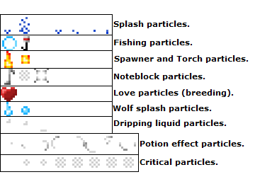 - Die meisten Partikel können durch ein Ressourcenpaket geändert werden. Die zugehörigen Datei ist minecraft.jar/assets/minecraft/textures/particle/particles.png.
