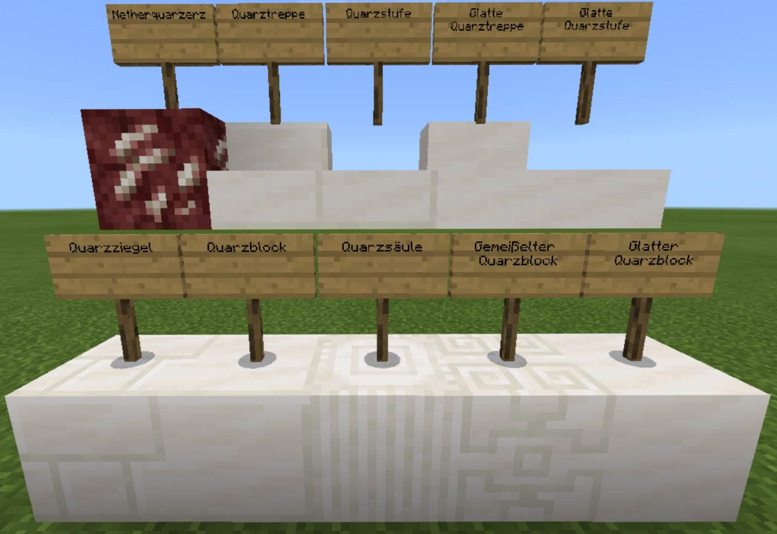 In der Bedrock Edition können im Gegensatz zur Java Version auch gemeißelte Quarzblöcke genau wie die Quarzsäulen mit verschiedenen Rotationen platziert werden.
