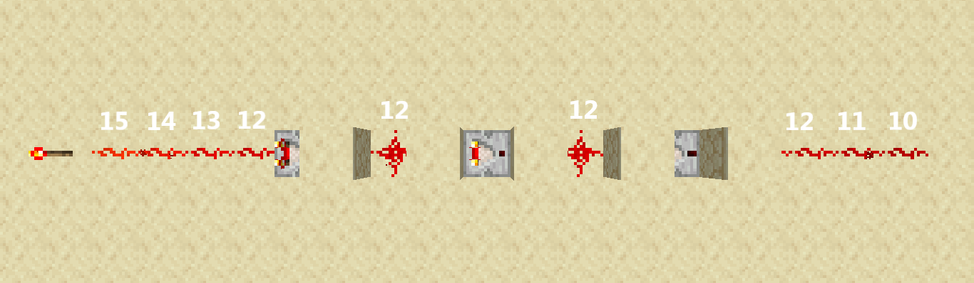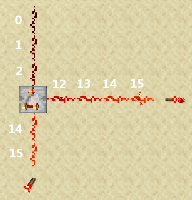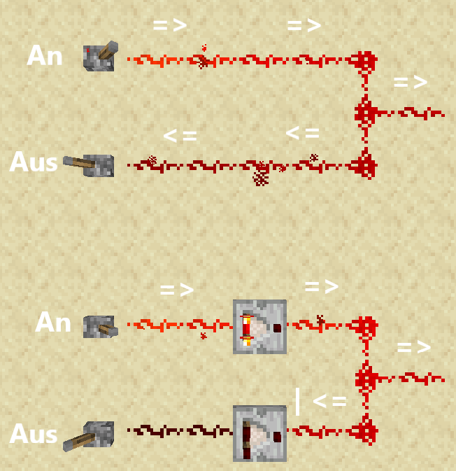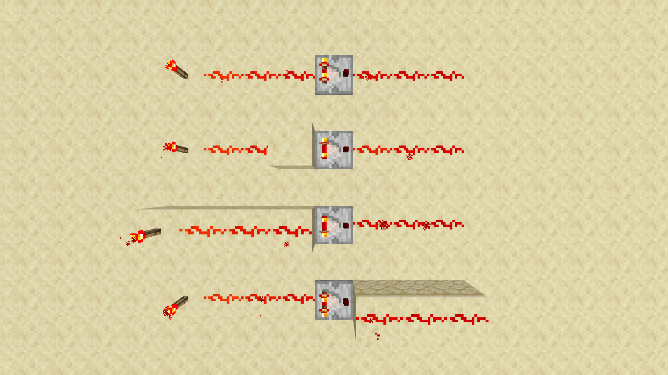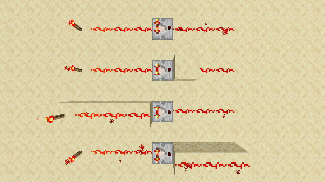 - Er vergleicht das Eingangssignal mit einem seitlichen Redstone-Signal und leitet das Eingangssignal nur weiter, wenn es stärker oder gleich stark ist. Ansonsten unterbricht er es.