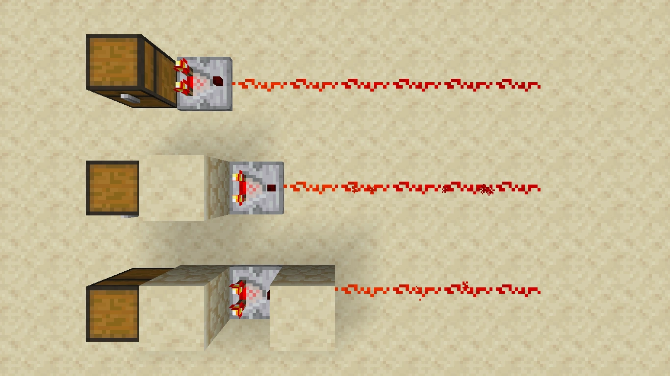 Der Redstone-Komparator kann sein Signal direkt oder durch einen soliden Block abgeben (linkes Bild). Ein solider Block (hier der Stein) gibt sein Signal nicht an ein Redstone-Kabel weiter, wenn er es von einem Redstone-Kabel empfängt (mittleres Bild; die Goldblöcke dienen zur Verhinderung der automatischen Verbindung des Kabels nach oben). Empfängt der solide Block das Signal jedoch von einem anderen Redstone-Element, wie z. B. von einem Redstone-Komparator, dann kann er es in alle Richtungen an ein Redstone-Kabel weitergeben (rechtes Bild). Somit kann ein solider Block verwendet werden, um ein Signal von einem Redstone-Komparator auch nach unten oder oben weiterzuleiten.