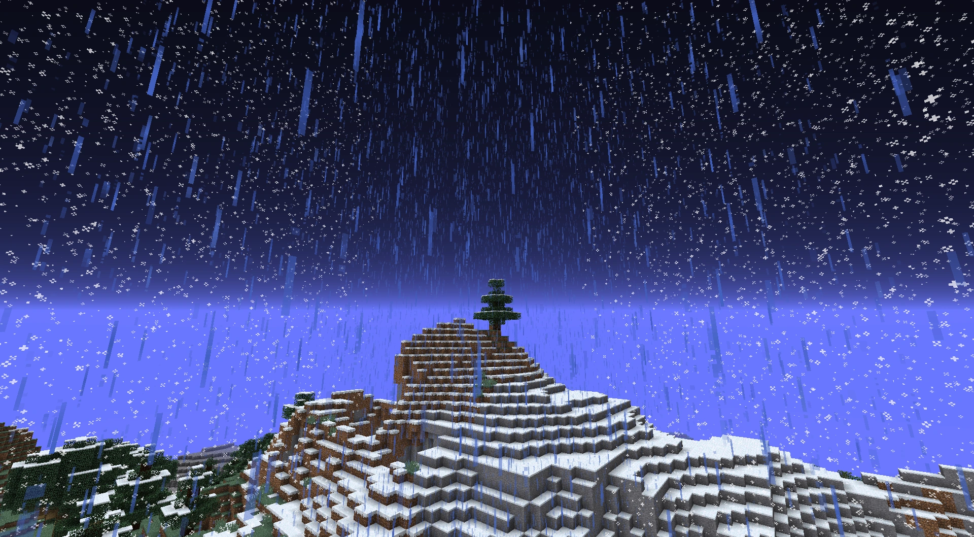 Befindet man sich zwischen einem gemäßigten oder kalten und einem verschneiten Biom, kann man gleichzeitig Regen und Schnee sehen. Dies wird besonders bei Flüssen deutlich, die durch verschneite Biome fließen, denn Flüsse haben ein gemäßigtes Klima und damit Regen. Bei Flüssen, die durch ein warmes Biom wie Wüste oder Savanne fließen, kann man dagegen sehen, dass es rundherum trocken bleibt, während es nur über dem Fluss regnet.