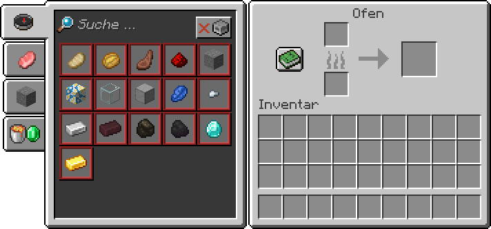 - Ofen: "alle Rezepte", "Nahrung", "Blöcke" und "Gegenstände".