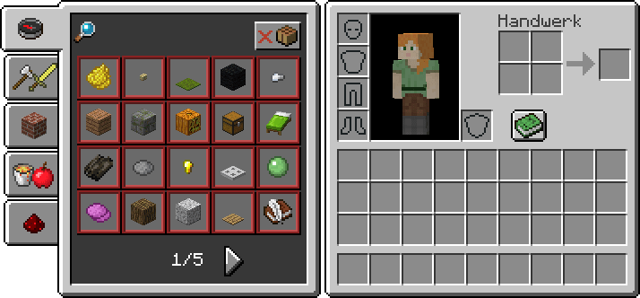 - Handwerk: "alle Rezepte", "Waffen, Rüstungen und Werkzeuge", "Baumaterial", "Gegenstände" und "Redstone".