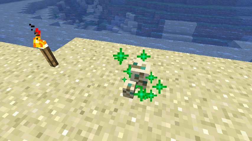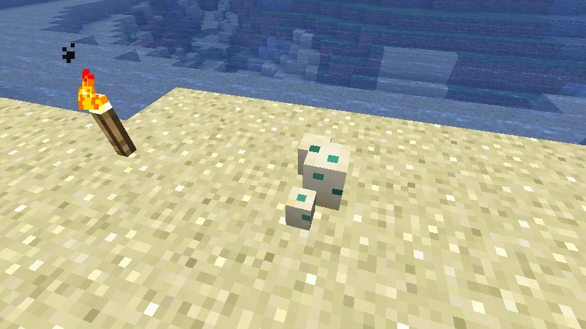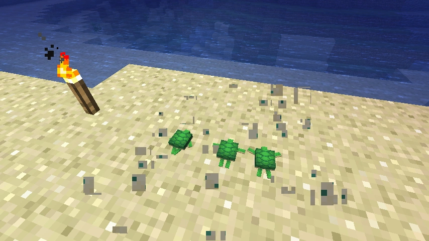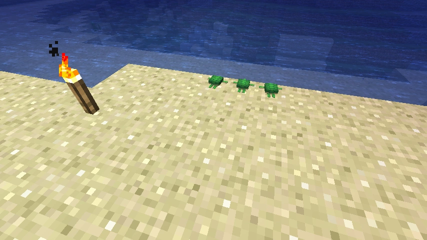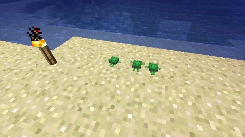 - Schildkröteneier können zwar überall platziert werden und benötigen auch nicht einmal einen Block unter sich, allerdings können Jungtiere nur schlüpfen, solange sich das Ei auf normalen Sand (nicht roter Sand) befindet. Dass man ein Schildkrötenei richtig platziert hat merkt man daran, dass nach dem Platzieren kurz grüne Sternchenpartikel aufsteigen.