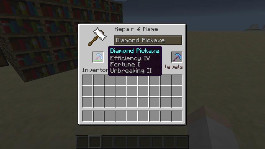 - Der Opfergegenstand ist ein Buch mit Schutz III, Schärfe I und Plünderung II.